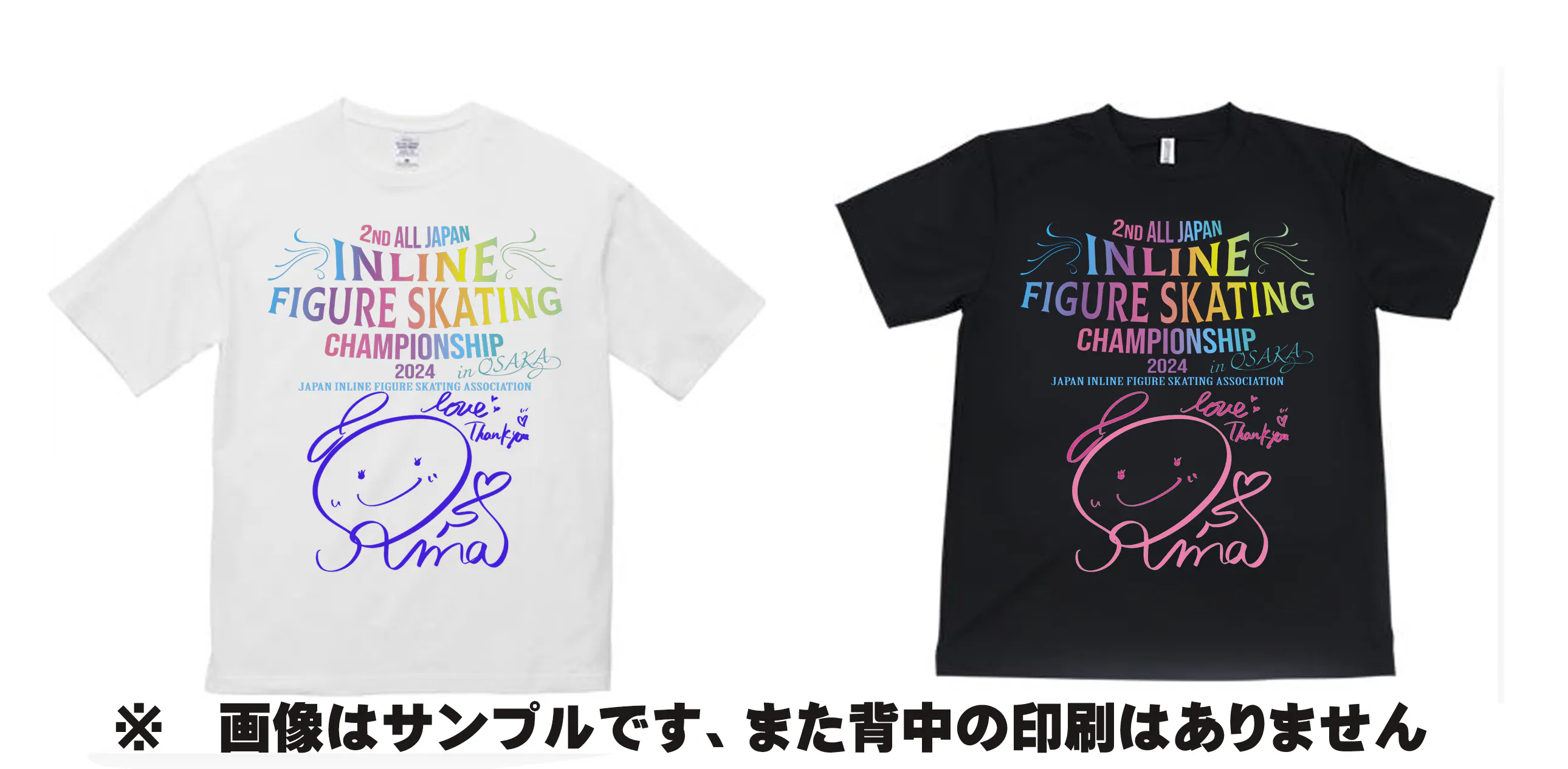 澤山璃奈さんのサイン入り第2回全日本インラインフィギュアスケート選手権大会Tシャツで色は白か黒をお選びいただけます。サイズは以下の通りです。
