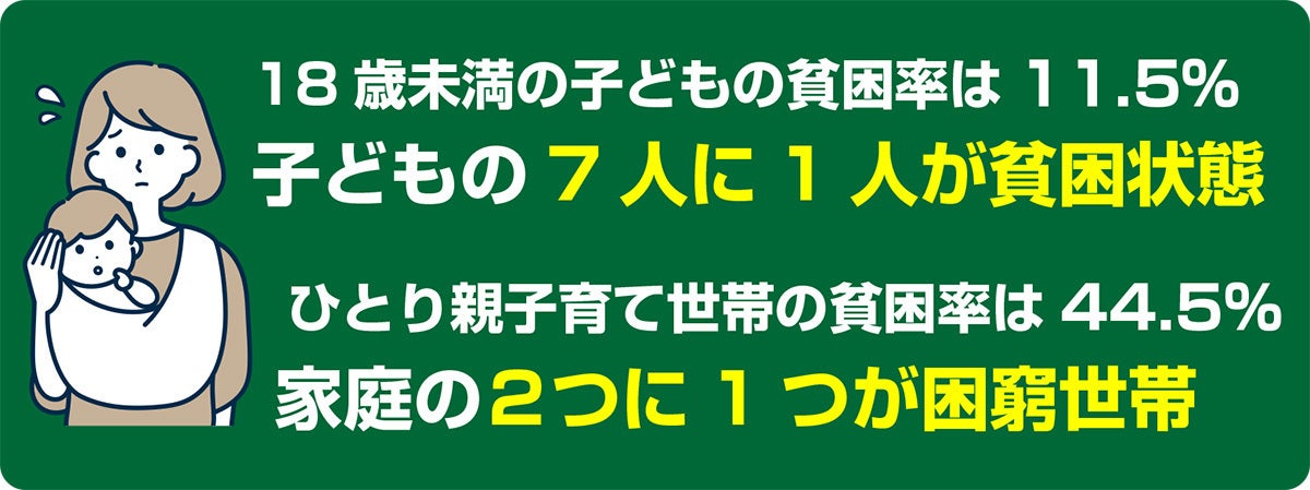 日本において、18歳未満の子どもの貧困率は13.5%、子どもの7人に1人が貧困状態となっています。大人一人で子どもを育てる世帯の貧困率は48.1%にもなります。(※厚生労働省発表、2022年国民生活基礎調査より、貧困率は大規模調査年のみ掲載)