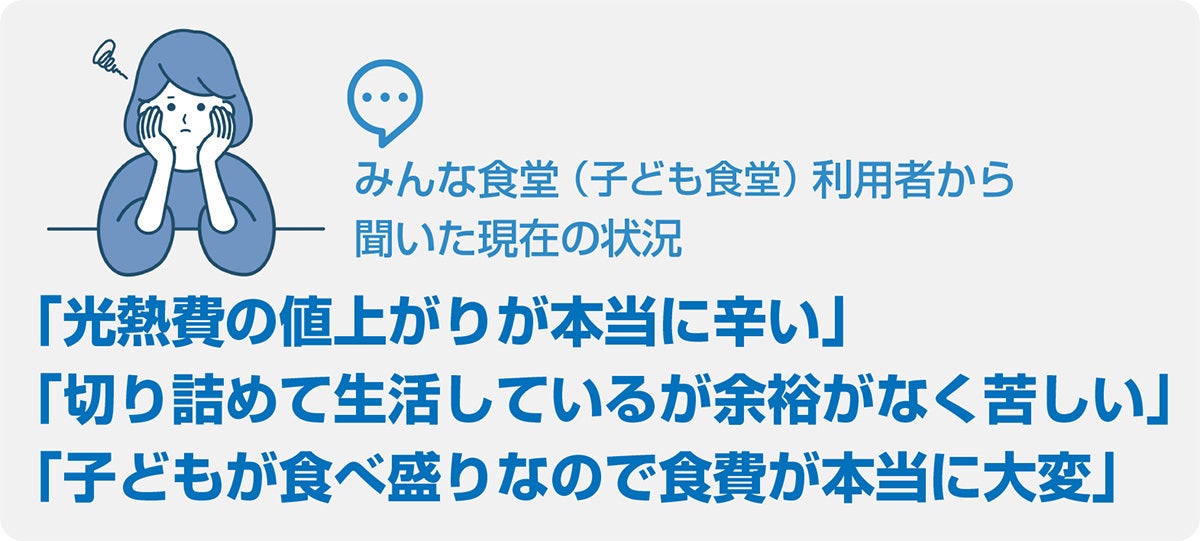 新型コロナの影響は落ち着いてきましたが、円安による物価高は家庭を直撃し、ひとり親家庭の生活は更に苦しくなっています。生活費はかかるばかりで、子どもを育てていくのはとても大変な状況といえます。もちろん両親家庭においても苦しい状況の子育て世帯は多くを占めています。
