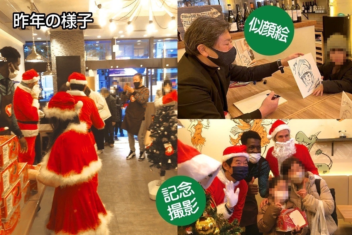 昨年は、ハートリボン大使の石田純一さん、セイン・カミューさんが、サンタクロースになって子どもたちにケーキを渡していただきました。また、柿本賢治さんが子どもたちに似顔絵をプレゼントしました。このクリスマスケーキ配布の様子は、NHKの夜ニュースで放送されました。