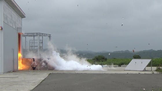 トップのコマ送り動画で、粉々になって飛んで行っているのが火炎に直接触れるグラファイト(炭素の塊、鉛筆の芯のようなものです)で、茶色の筒が繊維強化プラスチック製の断熱材、薄い銀色の板が一番外側で強度を持つ(今回は持てませんでした)超ジュラルミン製のケースです。