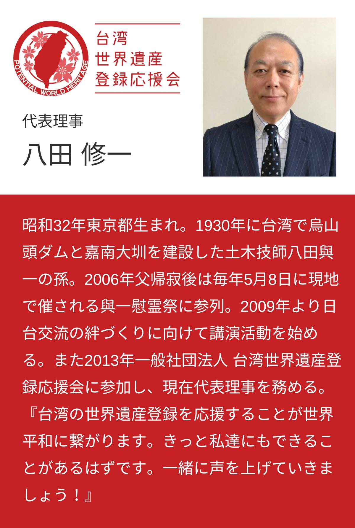 はじめまして。一般社団法人 台湾世界遺産登録応援会 代表理事の八田と申します。私たちは、台湾の世界遺産登録候補地18ヶ所の登録を実現し、平和な世界や観光・地域振興を進めるために活動しております。