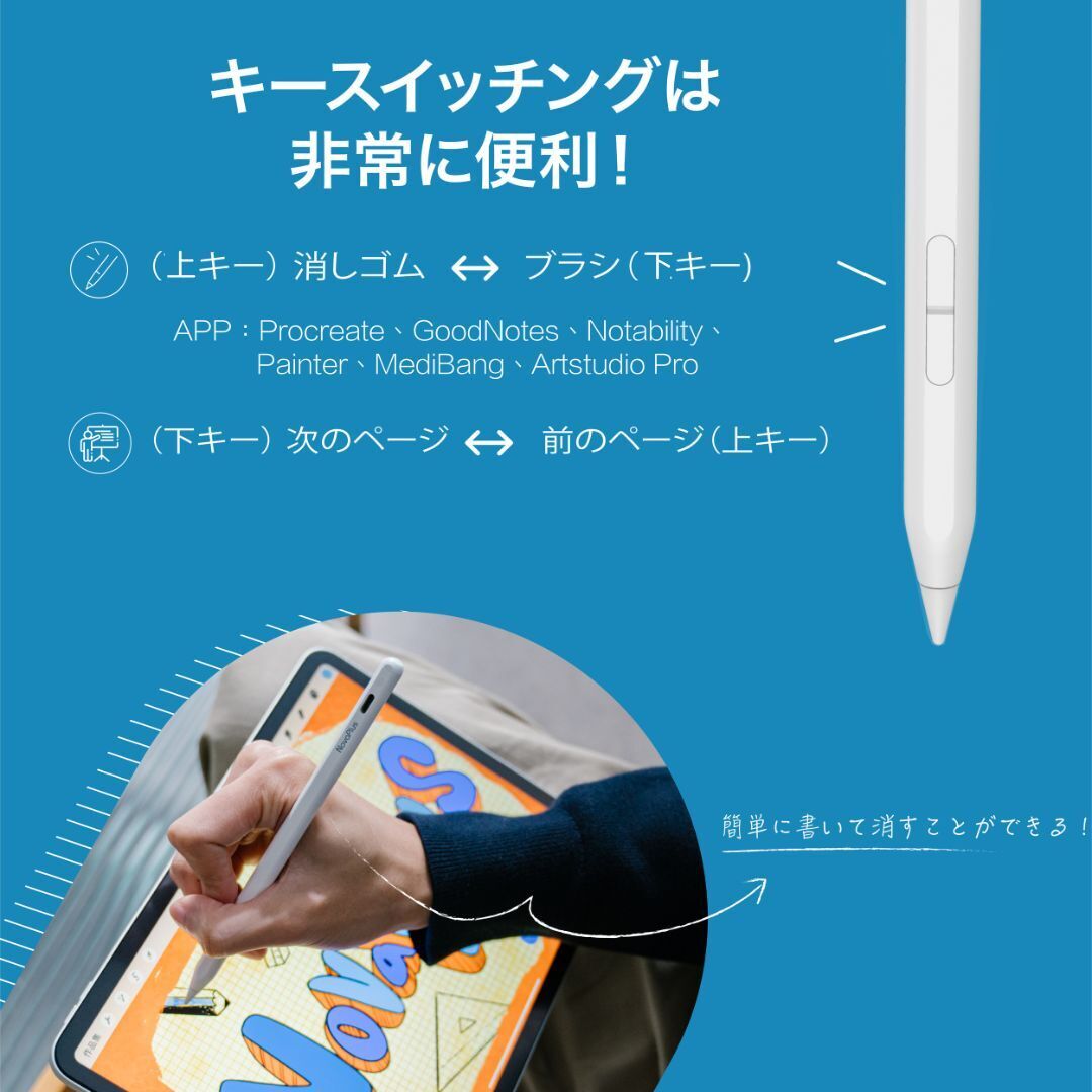 作業の効率化につながる、キースイッチングボタンによる消しゴム ⇆ ペンの切替機能が新搭載!物理ボタンのため誤操作になりにくくスムーズに。そしてストレスフリーなiPad生活に。
