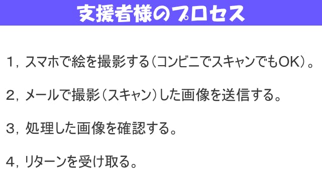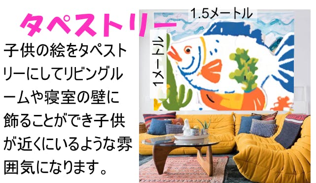 1、支援者のお子様の絵を大きなサイズのタペストリーにしてご提供します。支援者は、壁に飾ることで子供の小さい頃の姿を身近に感じる雰囲気を作ることができます。