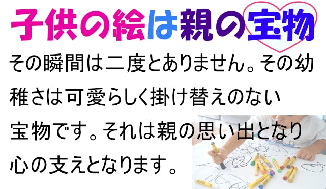子供が幼稚園や小学校の時に描いた絵は、その子供の成長過程を記録する大変貴重なものです。その瞬間、その年齢が過ぎると同じような絵は二度と描くことができません。その幼稚さと下手さは他人にとって無価値かもしれませんが親にとっては愛らしく掛け替えのない思い出になり一生の宝物となります。子供が成長し大学生になって家を離れたり仕事で遠方に行ってしまうと親は子供が小さい頃に描いた絵を眺めながら一緒に過ごした無邪気な日々を思い出します。その時、親の心には幸せと寂しさが入り交じりますがその思い出は数値では計り知れない人生の価値となり日々の心の支えにもなります。