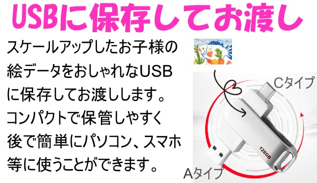 2、AI技術を使って子供の絵をデジタル化し長期保存に適した専用ケース付きのUSBに保存してご提供します。支援者は絵の紛失や紙の経年劣化などを心配する必要がなくなります。