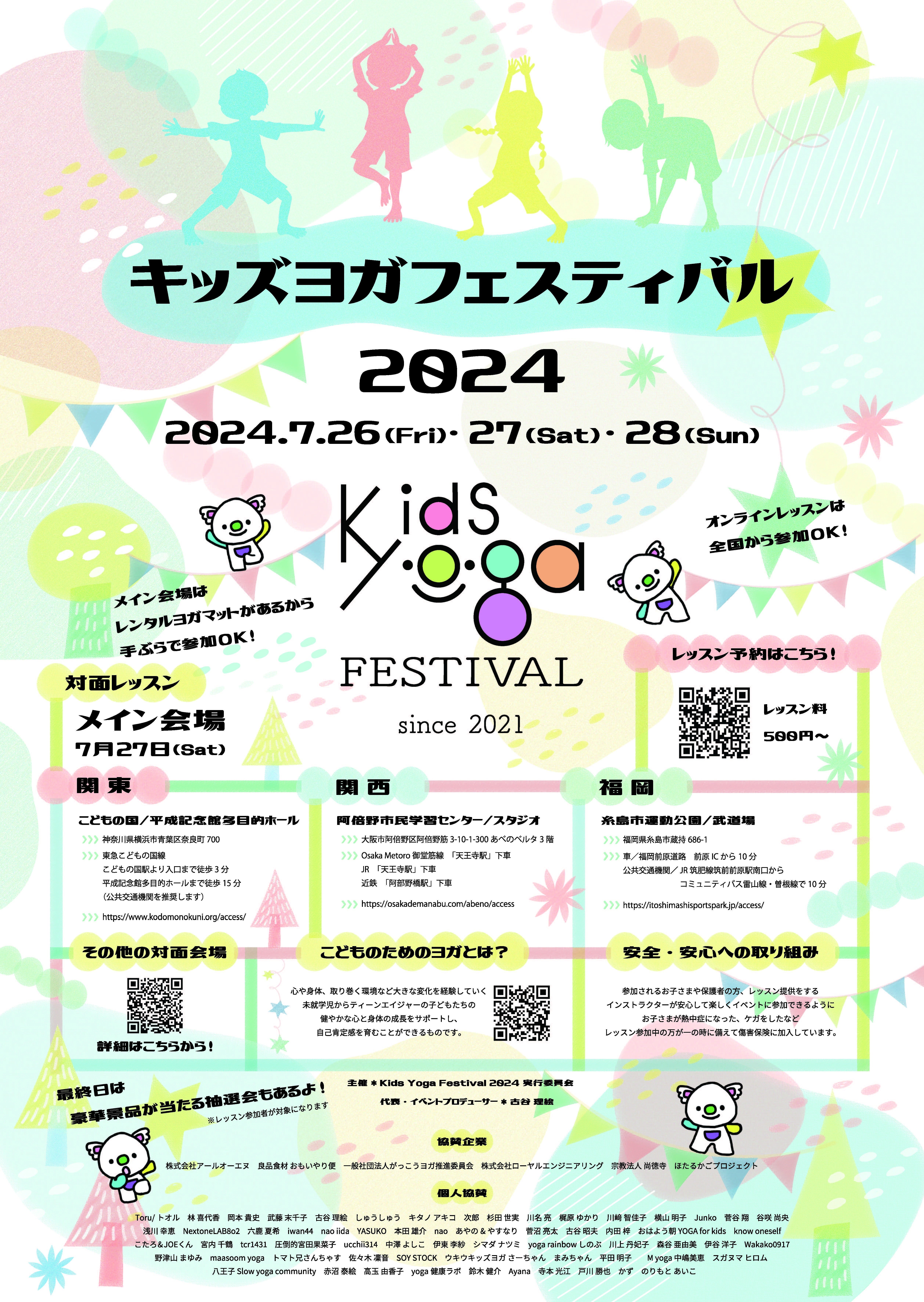 7月26日 27日 28日 関東、関西、九州のメイン会場3か所と全国各地の会場及びオンラインでKids Yoga Festival開催予定!