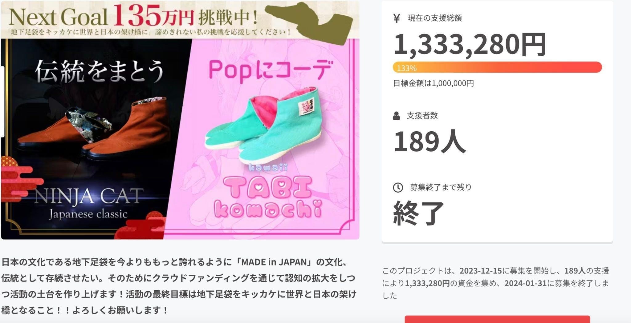ありがとうございました!無事終了しました。最後まで諦めなかった自分を褒めたいと思います。そして、最後まで走りきった私を一緒に支えてくださった皆様、本当にありがとうございました。集まった金額は、1333.280円。ネクストゴールに掲げていた135万円、キャンプファイヤーのサイト上には刻まれませんでしたが、実は、終了直前¥20000地下足袋をお買い上げいただいた決済がギリギリ間に合わず!という方がいて!実質達成!!数字って、ほんとうに、シビアです。途中、あまり動かずになったときは、「自分がやろうとしていることって魅力ないのかな」とか考えたりして、自信無くなりました。でもそんな時に、少しずつご支援をいただき、応援メッセージをいただき。その度に、ちょっとだけ 「あ、大丈夫かもしれない」と思えるように。かもしれない、が「大丈夫。私はこれを目指していいんだ」に変わり、また、応援をいただくたびに「絶対、大丈夫!」に変わっていきました。自分が人を応援するときは、その人に対して信頼もしてるし、絶対この人を応援したい!それに値する人だと思えるのに自分が応援される立場になると、思っている以上に不安になるし、揺らぐ。こんなに、心をぶらさず、最後まで駆け抜けるのは大変なことなんだって知りました。*世の中、いろんなクラファンがありますが、その中で、私は今回この自分のグラファンを「いいクラファンだった」自信を持って言えます。クラファンを使って、物を販売したり、こういうのに精通してる人がやるノウハウみたいなとこは確かに存在する。慣れてる人はさらっと達成まで持っていける、とか。すごい人もたくさんいるんだと思います。けど、私はそんな事はやっぱりできなくて。自分がやりたいことが軸にあって、そのために自分の思いを伝えて。伝えて、伝えて、やっと振り向いてくれた人に少しずつ応援していただくしかできません。でもそれでいいと思ってる。し、そのやり方が好きです。一生懸命、がむしゃらに走ることしかできないけど、その結果見えた世界があります。私自身、自分の発信に対してすごく気を遣います。求められない情報は届けたくないし、精査してます。だから、皆様が自分のことを、自分のアカウントでシェアしてくださるっていうのが、どれだけ貴重なことかと、今回本当にありがたく、沁みました。一握りの周りの人から、だんだん広がって最後は、知らない人からあったかい応援のメッセージやご支援が届き続けました。何度も言いますが、自分を信じてくださった皆さんが、ご自身の大切な信頼の中で私のことをシェアしてくださったからこそここまで広がったんだと思っています。私を信じてくれてありがとうございました。人の手で、人の思いで、達成しためちゃくちゃ、いいクラファンでした!!本当にありがとうございました。*とはいえ、泣きそう…とかいいながら、一粒の涙もこぼさず、ライブ配信をしながら達成の瞬間を迎えました。やっぱり最後は楽しく。あれやこれやいいながら、地下足袋と関係ない味噌をおすすめしたり、地下足袋の生地の柄で盛り上がったり。そう、やっぱり楽しくないと!!なんかこれも私らしいなと思いましたw涙が出そうになる瞬間に、毎度おもろいコメントが来て、そんな気持ちは引っ込んでました。色んな意味でありがとうございました。そして、今後ですが!ここからがスタート。皆様からの広がった愛のご支援で、土台をつくり、今度は世界中の人に広げていきたいと思います!実は色々まだ発表したいことも山盛りあります。今後の更新や、発表はCAMPFIREの活動報告や、Instagramをご覧ください!!早速ですが、Instagramはクラファンの話題を(あんなに一生懸命発信したけど)これからサヨナラしていきます。新しく、ブランドとして作り替えますのでそれもお楽しみに!!フォローまだの方はぜひフォローしてお待ちくださいませ!https://www.instagram.com/ninjacat_neo?igsh=MWd6MmV5dGRpaTB5cQ%3D%3D&utm_source=qrこの度は、本当にありがとうございました!