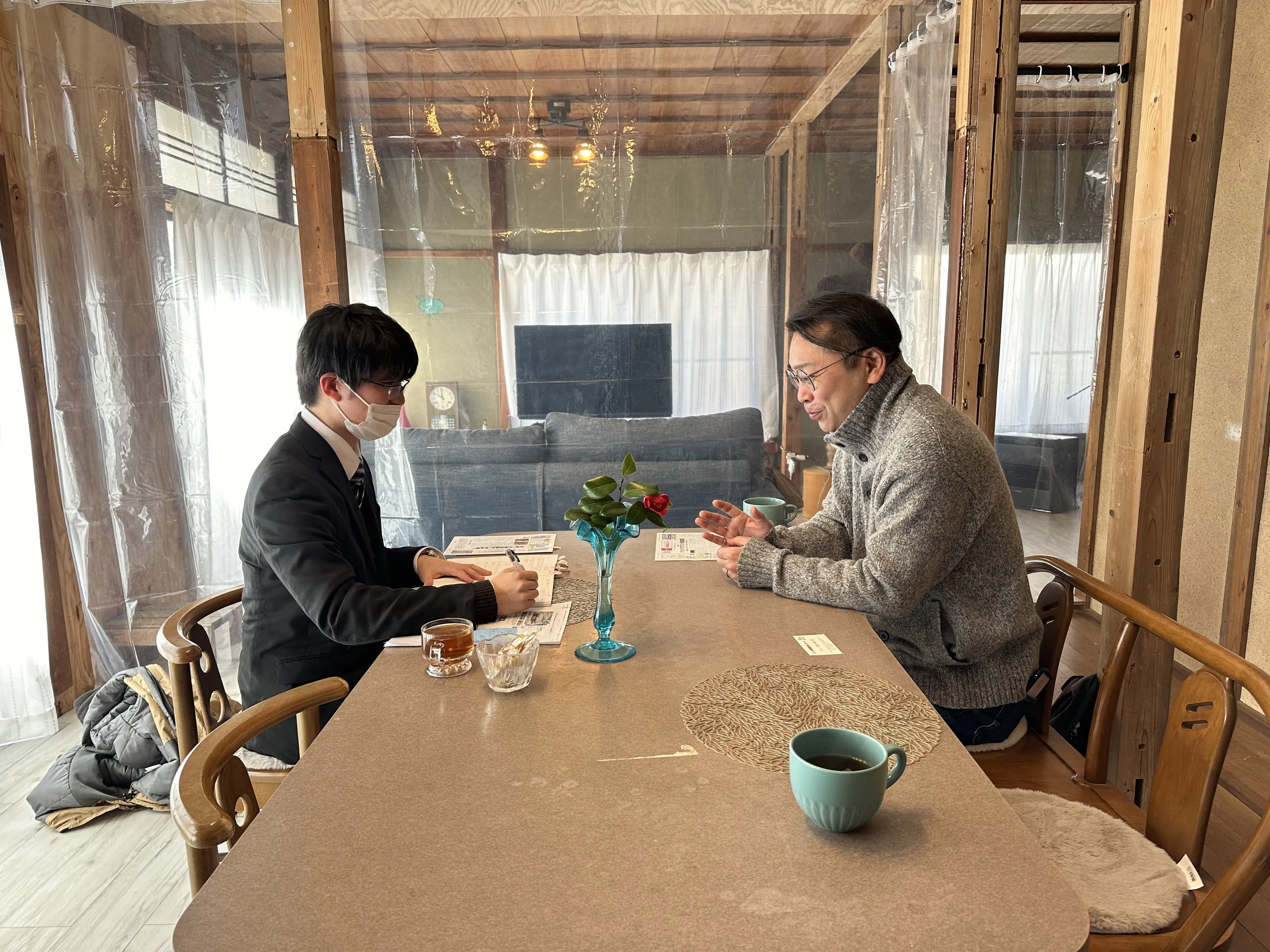 取材の内容は、私たちが中島に移住することになったきっかけや、私たちがこれから作ろうと思っているお店の内容など、たくさん質問していただきました。