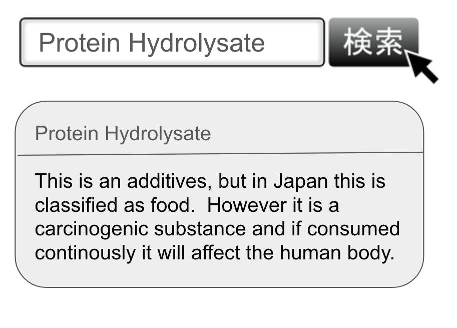 添加物辞典では気になった添加物を調べることができます。アプリ内に検索という場所を設けるのでそこに気になった添加物を入力するとその添加物の詳細が出てきます。 日本語がわからない外国人でもこのアプリを使って、タップすると英語で添加物の説明が読めます。