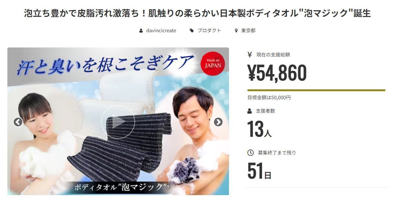 本日プロジェクトを公開しました!この度は弊社のボディタオル”泡マジック”に興味を持っていただき誠にありがとうございます。タオル1枚だけで、いつもと違う泡が作れ、楽しいバスタイムを演出するアイテムです。この泡で、あなたの体の汗と臭いを吹き飛ばしましょう!プレゼントにも最適ですね。まずは、無事公開&初日からの支援をいただき感謝申し上げます!