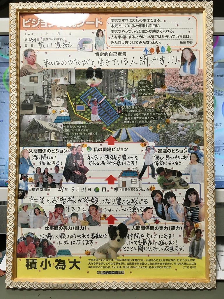 当時は自宅兼事務所があっただけで、他には何も無いところからでしたが、いろんな方の協力やご支援、厚情に恵まれ、ほどなく現在の土地に太陽光発電所ができあがり、その後日本で初めてZEH(ゼッチ)と呼ばれるゼロエネルギーの基準を満した、ビジョンシートに描いた通りのログハウスを日本で初めて認定付きで建てることができました。
