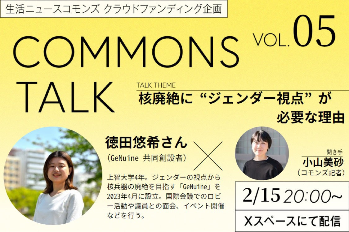あす2月15日午後8時~9時のコモンズトークは、ジェンダーの視点から核兵器の廃絶を目指す「GeNuine」の共同創設者・徳田悠希さんをゲストに迎えます。テーマは「核廃絶に“ジェンダー視点”が必要な理由」。聞き手は広島在住の小山美砂記者です。ぜひご視聴ください。