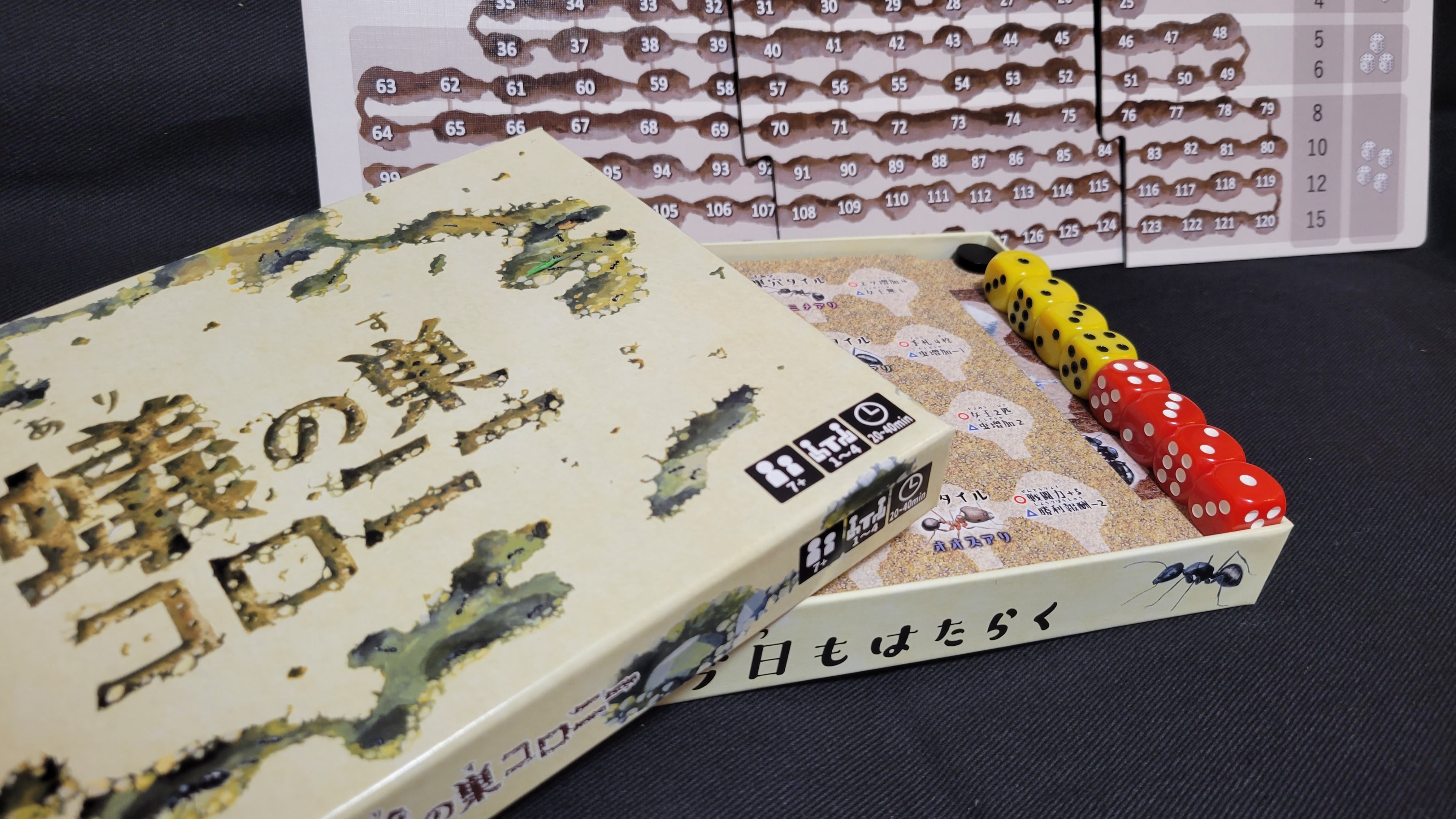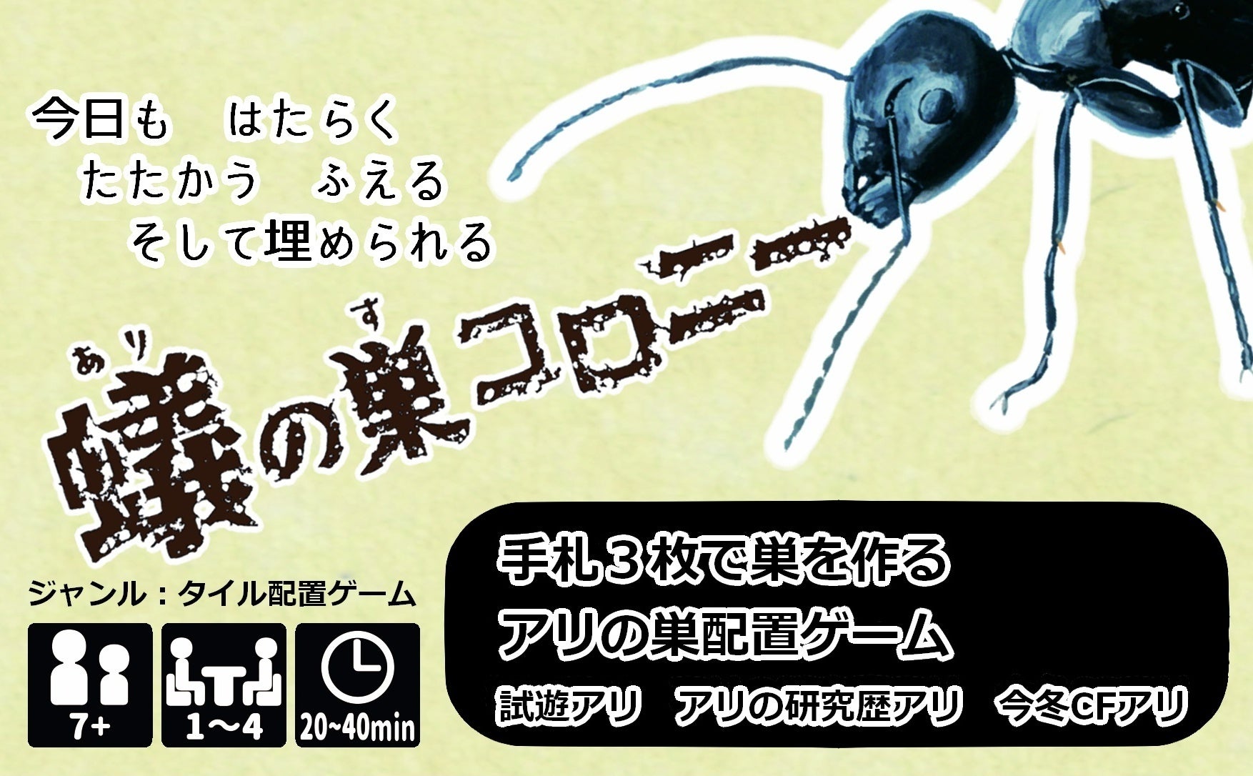 2024/06/08 19:47お久しぶりです。ゑげゑむずのロビンです。〇近況報告など一部配送に遅れがありました『蟻の巣コロニー』ですが、無事5月の2週目に配送が完了しました。もし、届いた製品に不備がある場合、ルールの不明点等があればクラファンのメッセージ等でお問い合わせください。また、余談ではありますが、春先に出展したゲームマーケット2024春について、現在、新作評価アンケートが実施されています。https://docs.google.com/forms/d/e/1FAIpQLScKTf_UfUr3po2_7SkkibLutsYd6VDG7iNUHnOhGRGu_EdUJA/viewform?s=096月9日(日)までと〆切間近ですが、もし良かったら『蟻の巣コロニー』に投票していただけると嬉しいです.ˬ.)"〇通信販売&出展予定についてご好評を博した『蟻の巣コロニー』について、BOOTH、ボドゲーマさんにて通信販売のお取扱を開始しております。また、今後の出展イベントについてですが、8月10日(土)に川崎のゆぷまるというボードゲームイベントにて、11日(日)に横浜のAWAKEという生き物イベントに出展予定です。また、10月には徳島のボドゲイベント、京都のいきもにあという生き物イベントにも出展予定です。もし『蟻の巣コロニー』を遊んでいただいた御友人等で興味を持っていただいた方がいればご紹介いただけるとうれしいです。多くの人に遊んでいただけるように、また自然に興味を持っていただけるゲームとして楽しんでいただけるように今後も頑張りますので、これからもよろしくお願いいたします。 もっと見る製品の到着一部遅延のお詫び
