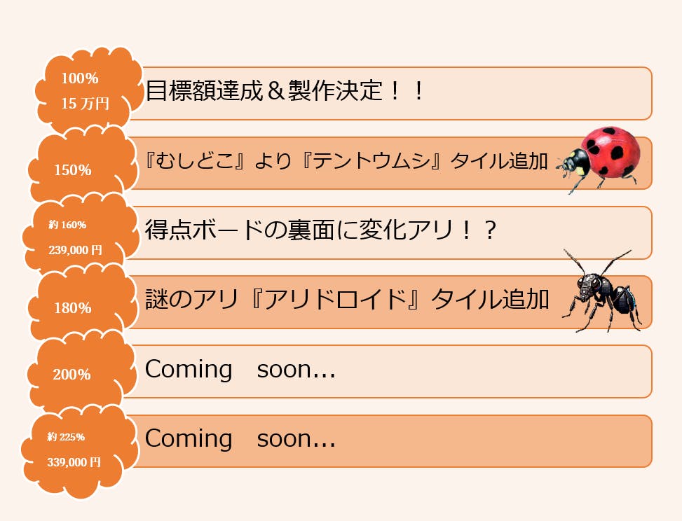 今回、早期の達成のおかげで、当初予定していたよりも多くのグレードアップが望めそうです。そのため、当初予定していたストレッチゴールよりも達成額のハードルを下げさせていただき、可能な限り多くの追加要素を加えることにしました。上記以外にも追加タイルの予定をしておりますので、ぜひ応援をお願いいたします。