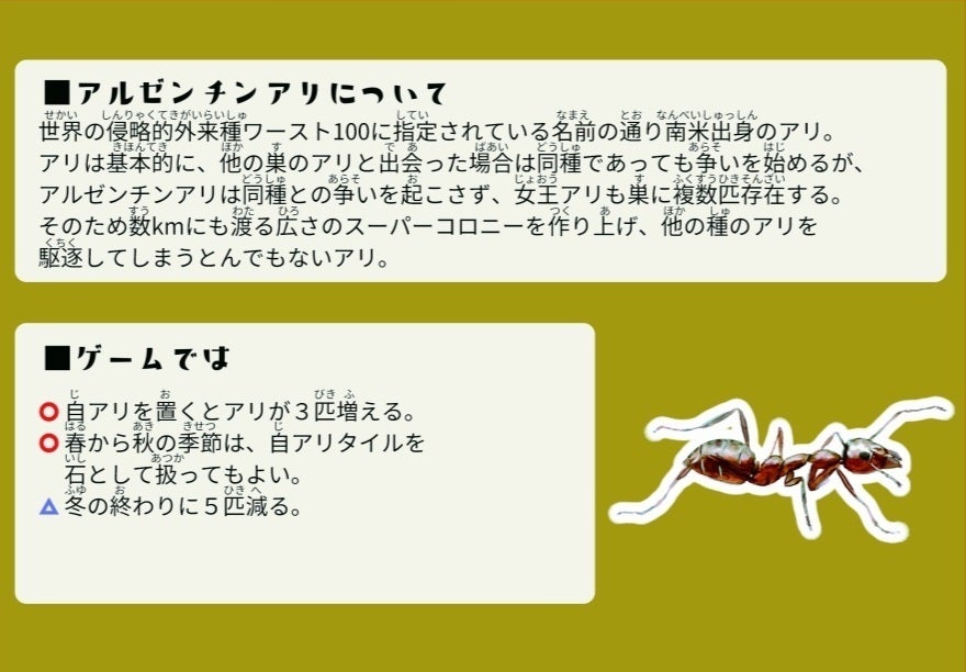 侵略生物界で悪名を轟かせているアルゼンチンアリです。アリは同種であっても巣が異なれば喧嘩をするのですが、このアリは喧嘩をしません。そのため爆発的な勢いで増え、他のアリを駆逐してしまうアリです。自アリタイルがあれば得点、妨害どちらにおいても強いアリですね。