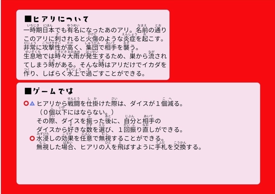 世間では、アルゼンチンアリよりも有名な侵略生物ヒアリです。その攻撃性を生かして、ゲームでは2回攻撃のチャンスがあります。ただ、ダイスが1個減ってしまうので1ダイス同士での戦いや、相手よりもダイス数を増やした後で使いたいところです。テストプレイでは、水浸しで手札を交換されない点も好評でした。意外と知的な戦い方になるかもしれません。