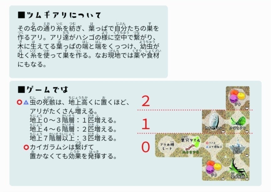 樹上で生活するツムギアリです。地上に巣を伸ばすタイプがいてもいいなということで参戦しました。能力としては、クロオオアリ(虫の死骸の増える数が-1)の逆バージョンといったところですが、このゲーム地下には伸びにくいのに、地上にはめちゃくちゃ伸びやすかったのですぐに7階層以上に到達できます。いつもとは違った感覚で遊べるちょっと楽しいアリです。