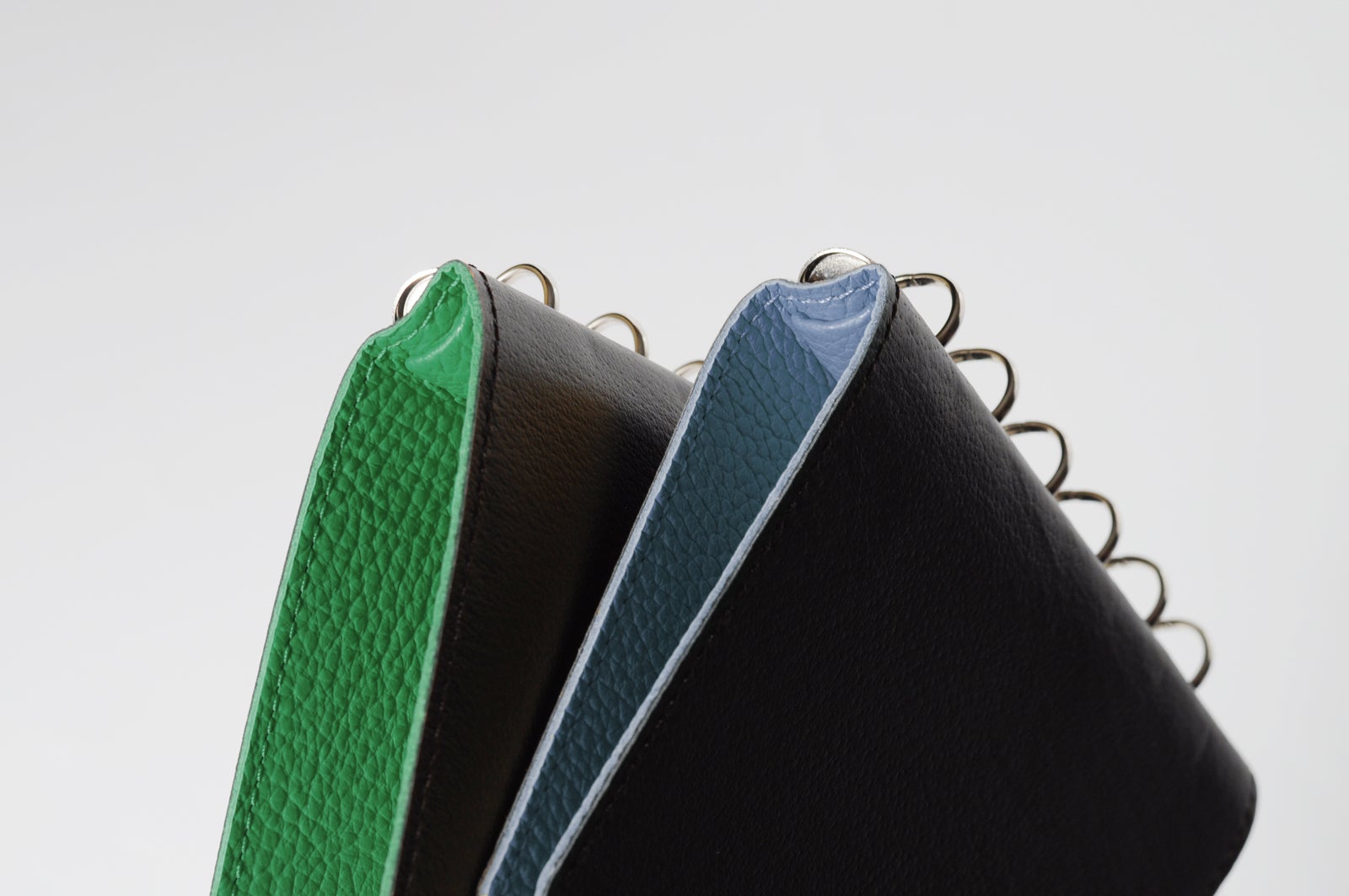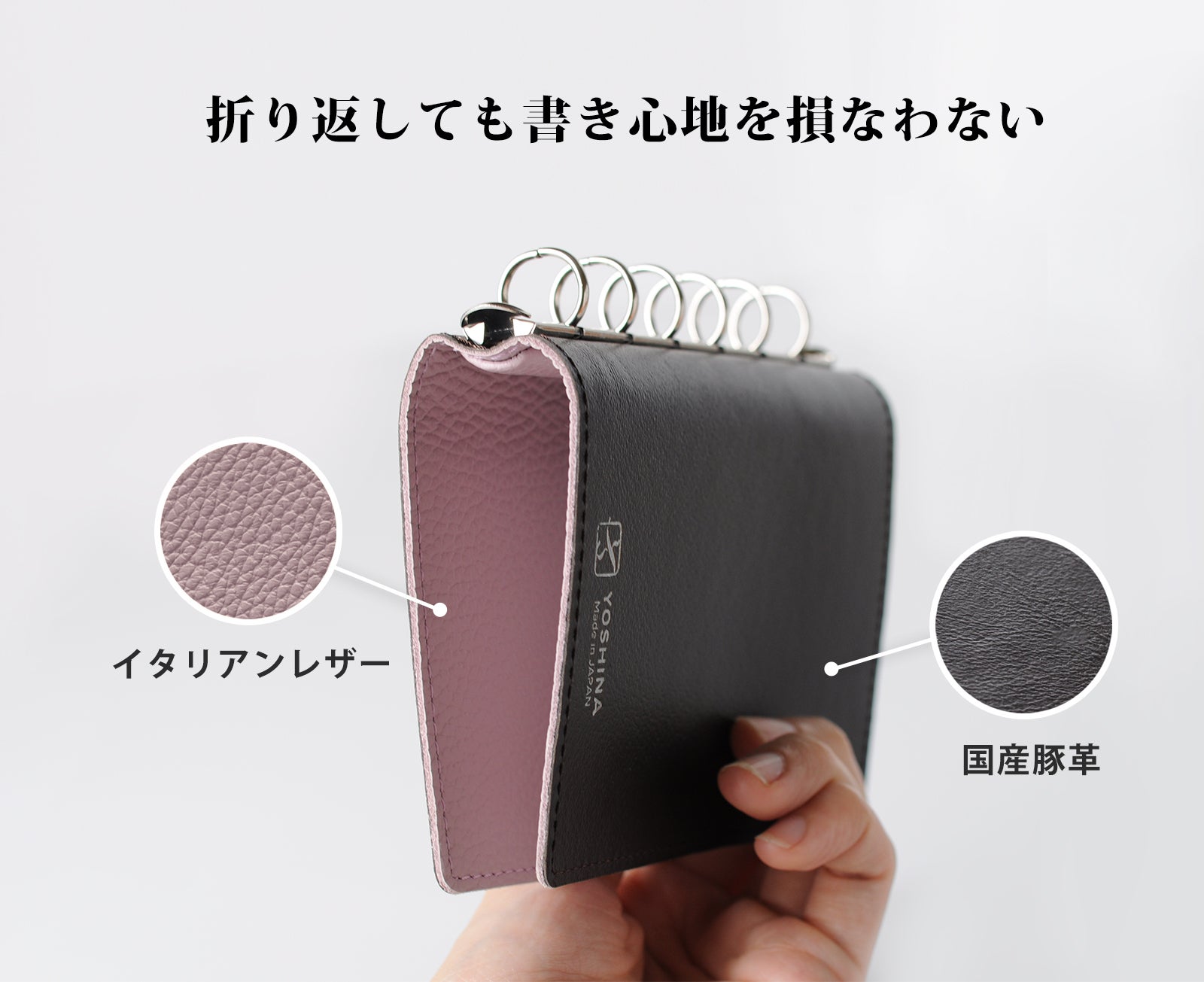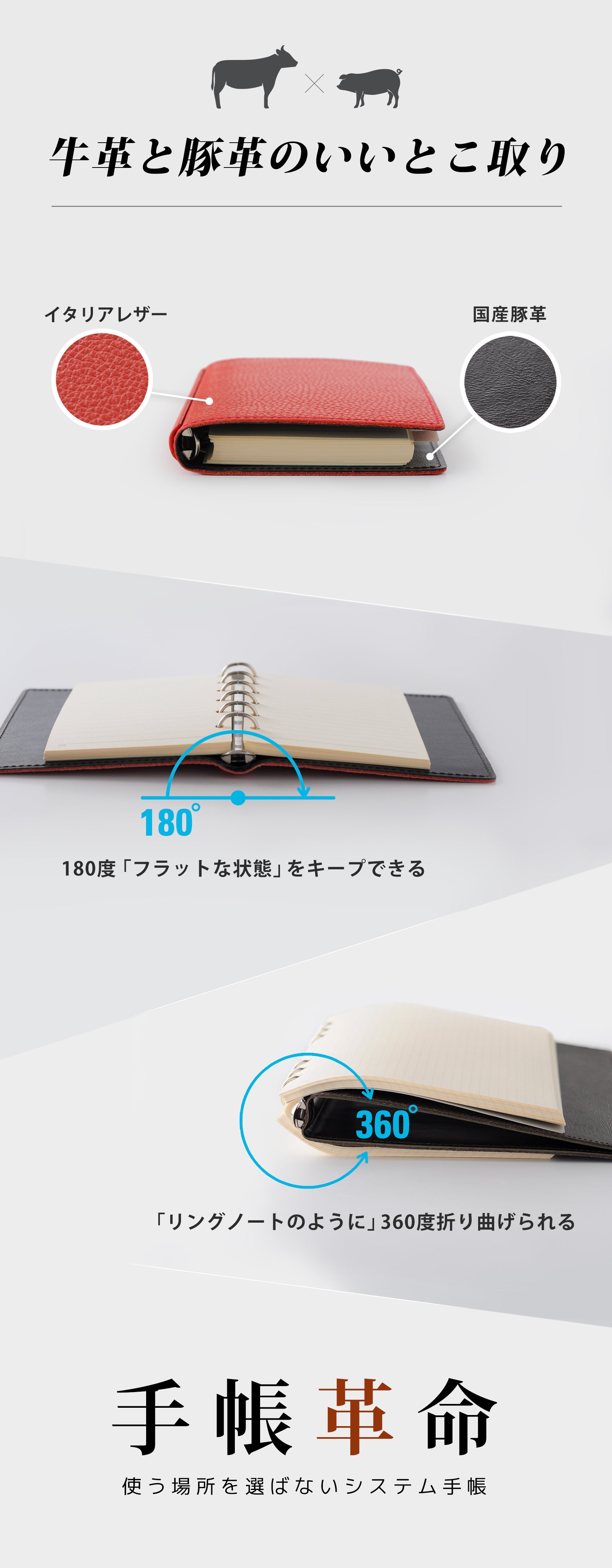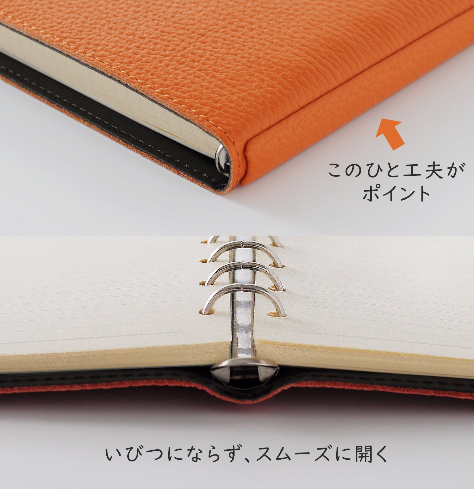 バックプレートとリングで、貼り合わせた一枚革を挟む構造により、180°開いたままの状態で使用できます。また、デスクがない環境では折り返した状態で使用可能です。