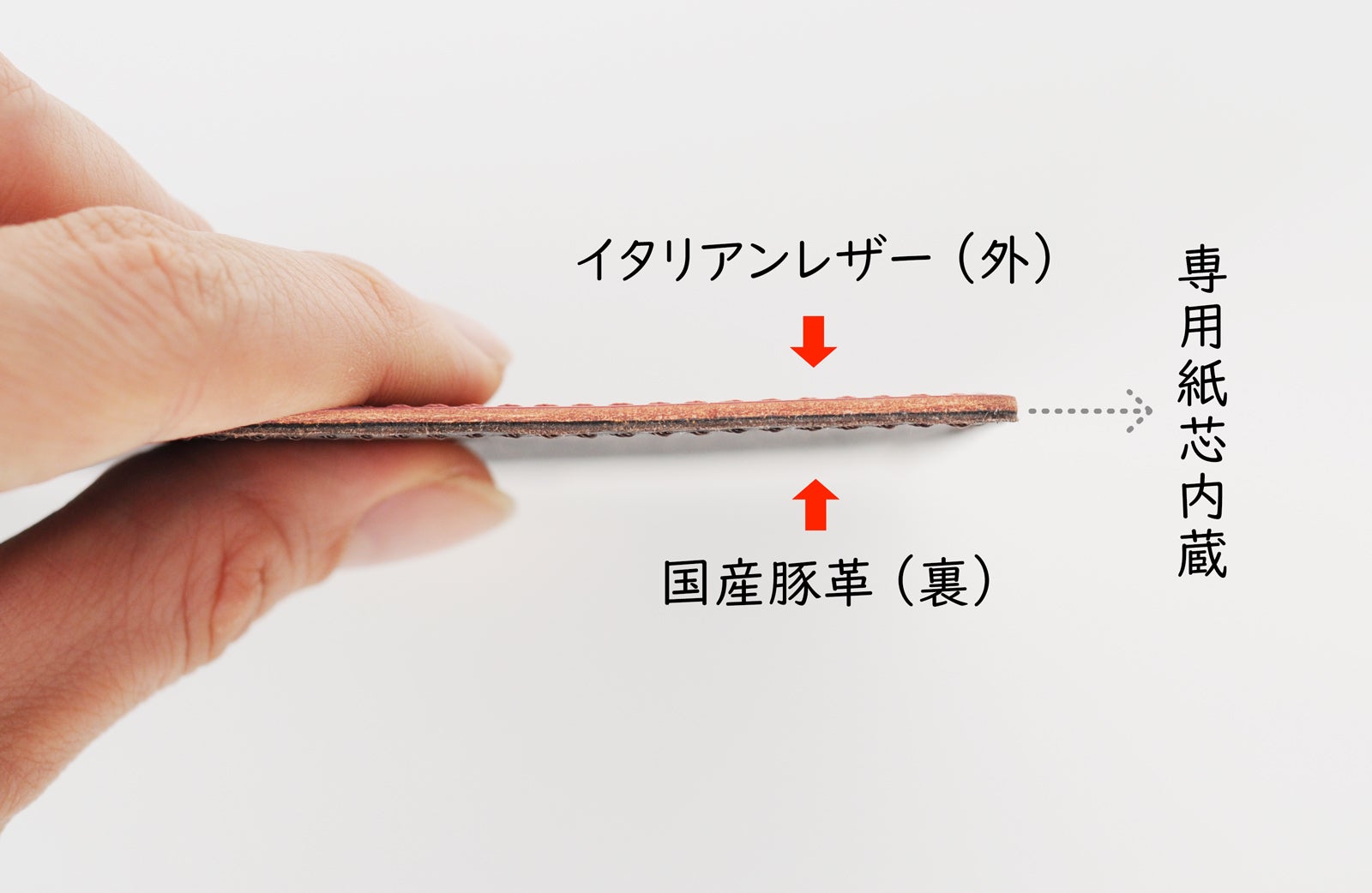 YOSHINAは、より長くお使い頂くことと書きやすさのために、革の間に強度の強い紙芯を貼り合わせています。そのため、手帳の形が崩れにくいほか、折り返した状態で使用する時も、下敷きの効果を発揮し、デスクの上と同じ書き心地が保てます。
