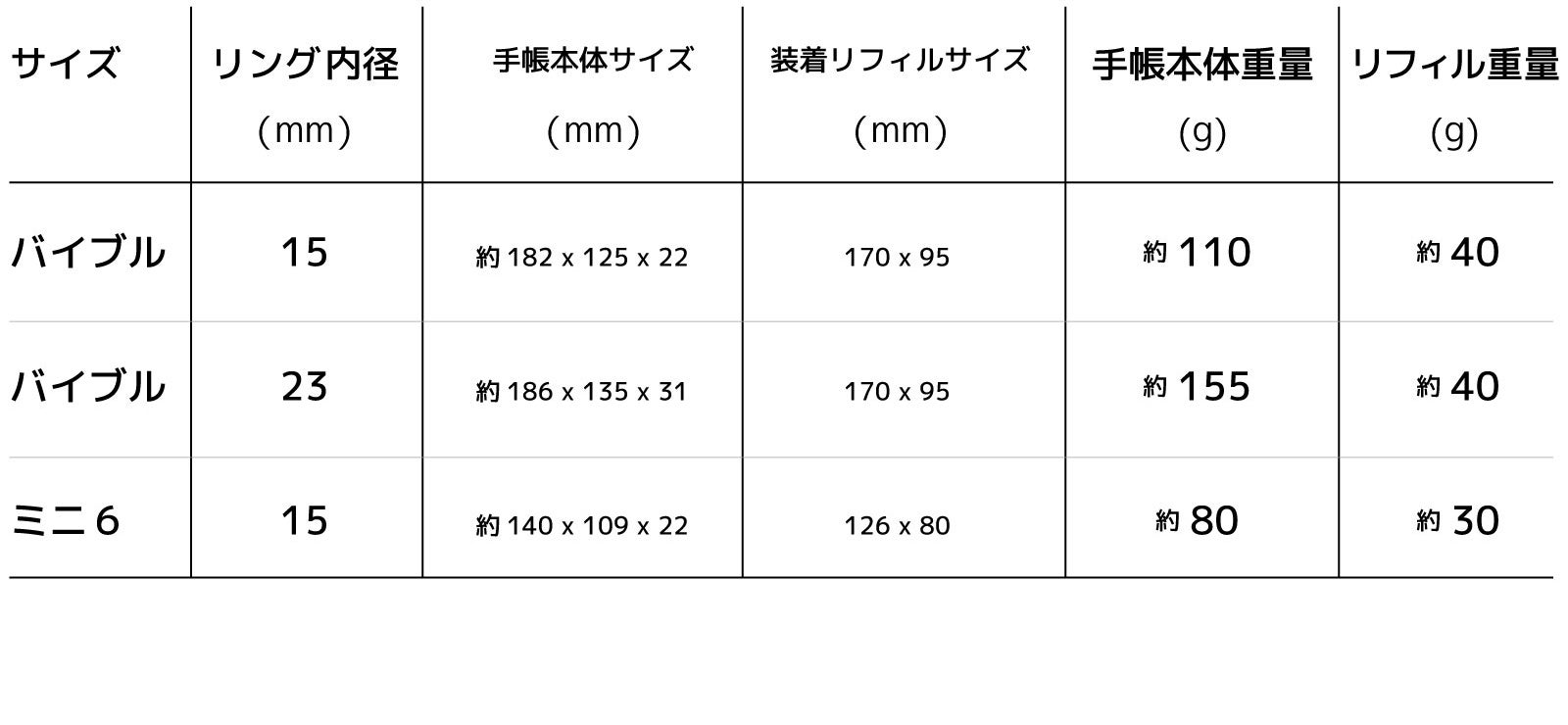 ■ バイブル(聖書)サイズ [170 x 95mm] リング径φ15mm ※ [ ] 内は、装着可能の市販リフィルサイズです。
