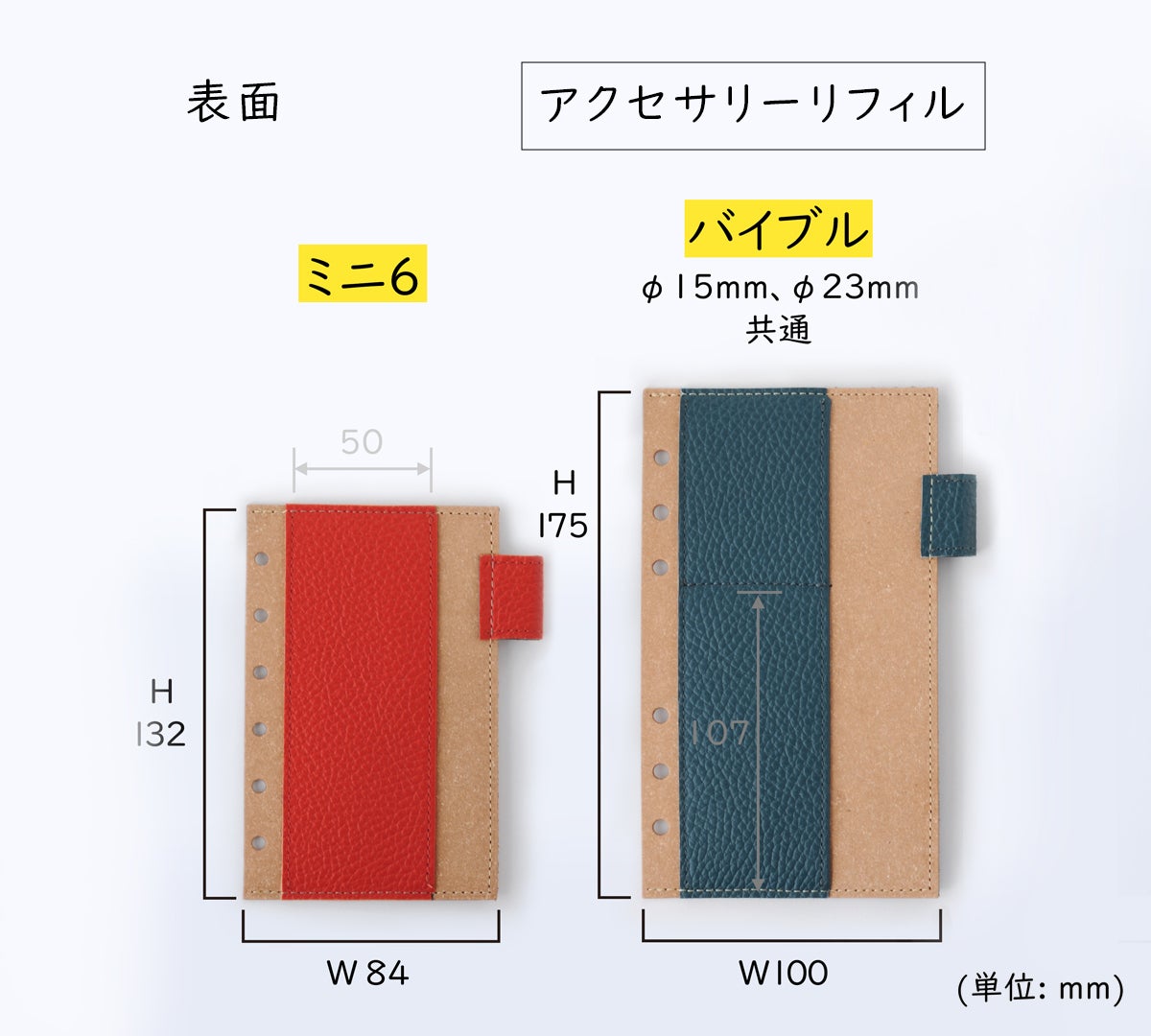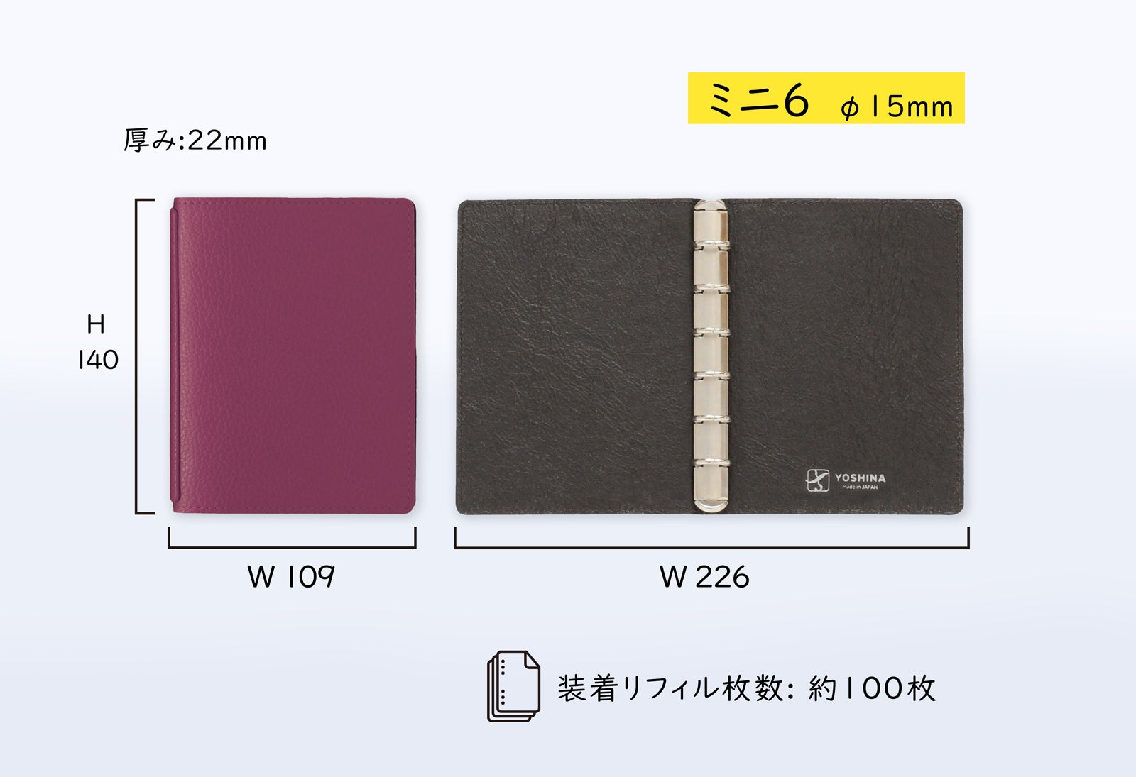 ■ ミニ6サイズ[126 x 80mm] リング径φ15mm ※ [ ] 内は、装着可能の市販リフィルサイズです。