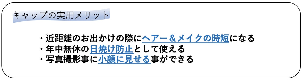 ファッションシーンで多くの女性が被っていると予想されるキャップと比較して、帽子工場さんと開発した【小顔効果】をご理解頂けると嬉しいです。