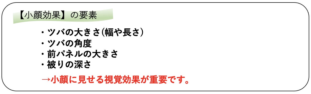 顔を小さく見せるには、可能な限りツバ幅が顔の輪郭線(輪郭幅)以上でないといけません。ツバ幅が顔の輪郭線(輪郭幅)より狭いと、正面から見たときに顔が大きく見えてしまいます。