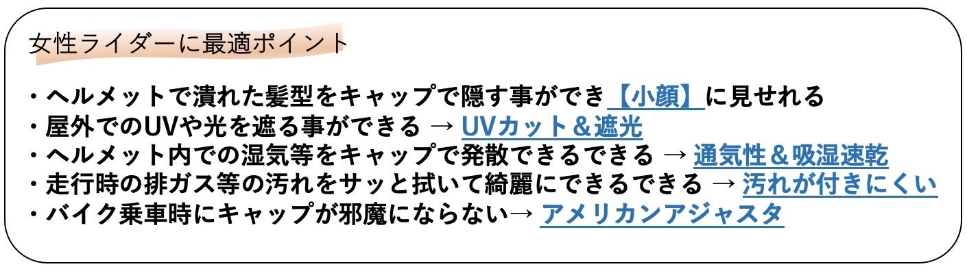 ファッションシーンでもバイクシーンでも使える多機能で【小顔効果】を徹底追求したキャップの実力を一人でも多くの女性に体験して頂ければ幸いです。