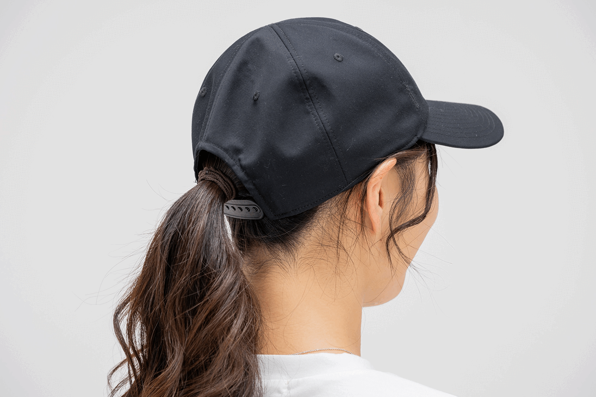 そして、アメリカンアジャスタを採用している【小顔効果】を徹底追求したキャップの後の開口部が大きくなっています。この開口部の大きさにより束ねた髪の毛を外に出しやすくなっています。