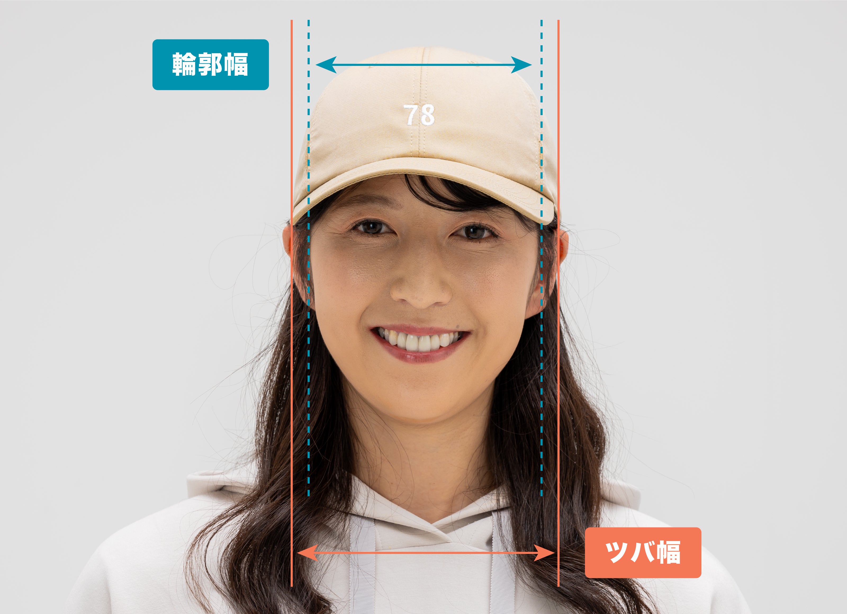 ツバ幅が顔の輪郭線(輪郭幅)以上だと小顔に見えます。更に緩やかなカーブを用いて、キャップと顔の境界線を弱くし、柔和な印象を作り出しています。