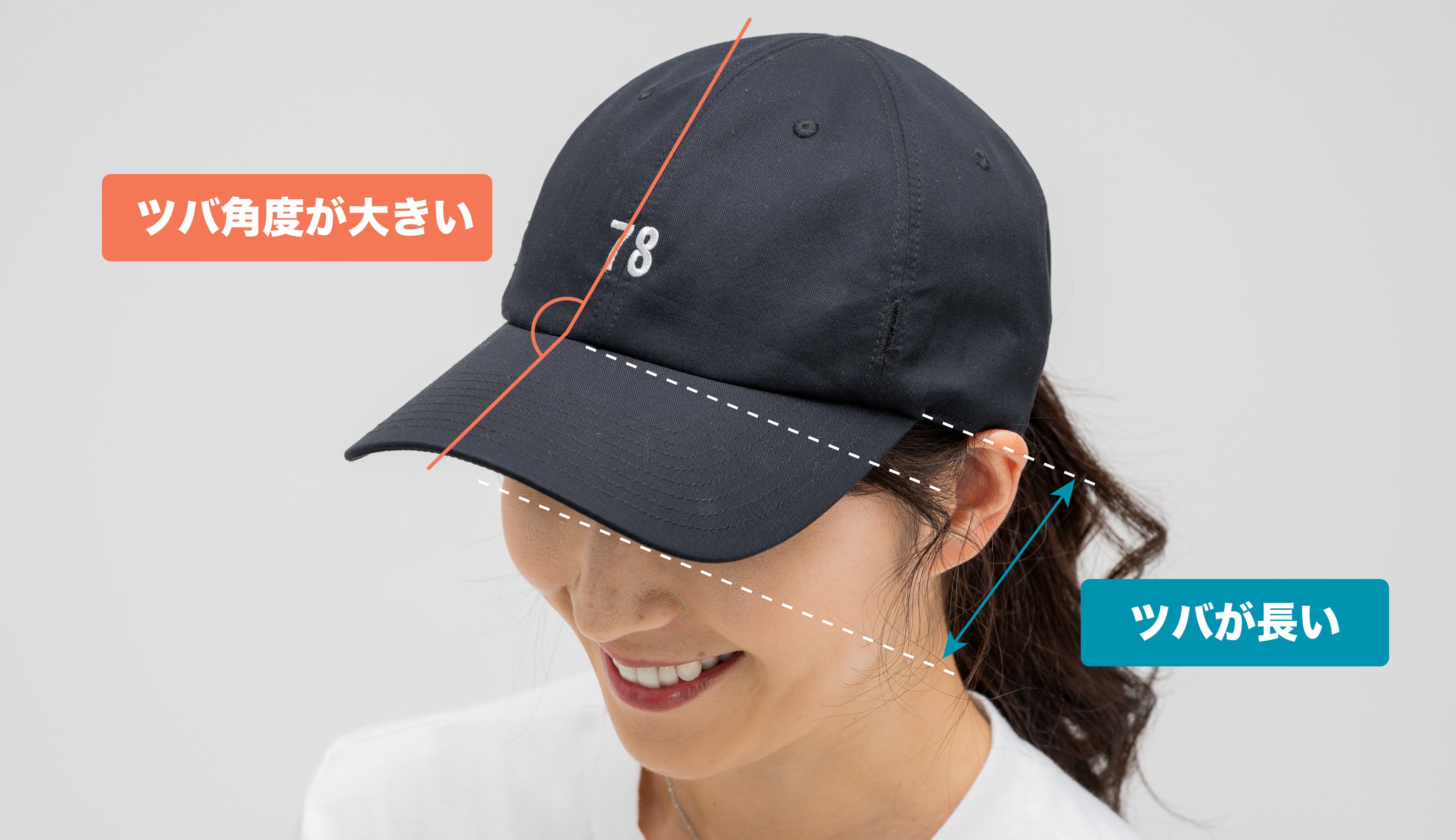 顔を小さく見せるには、見える顔の面積を小さくしなくてはいけません。ツバの角度が小さく、ツバの長さが短いと顔が隠れなくなるので顔が大きく見えてしまいます。