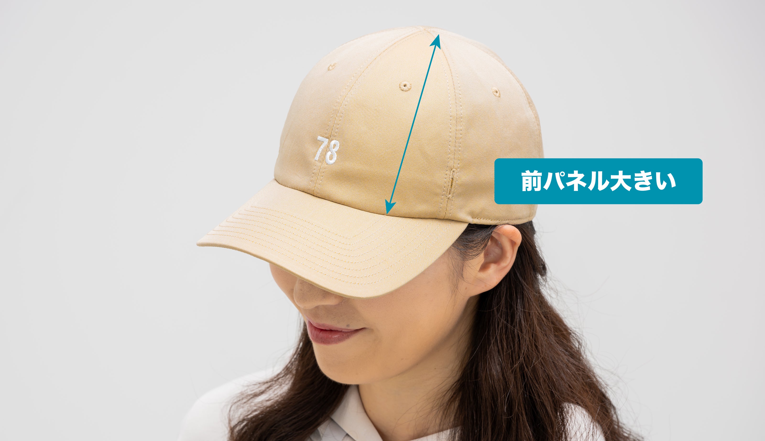 顔を小さく見せるには、帽子の面積を顔より大きくしないといけません。正面から見た時にキャップの前パネル部分が小さく見えると相対的に顔が大きく見えてしまいます。