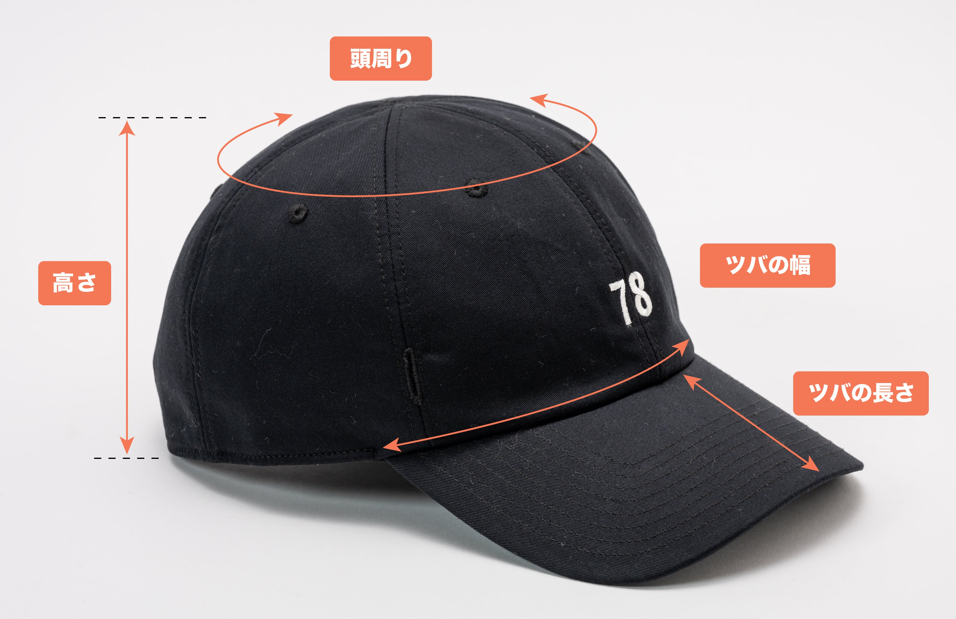 ・寸法:頭周り 57.0cm(アジャスタで55.0〜58.5cmまで対応) / ツバの長さ 7.0cm / ツバの幅 19.0cm / 高さ 13.0cm・素材:マットな光沢感のある表情をした高密度でしっかりとしたオールシーズン着用可能な素材です。