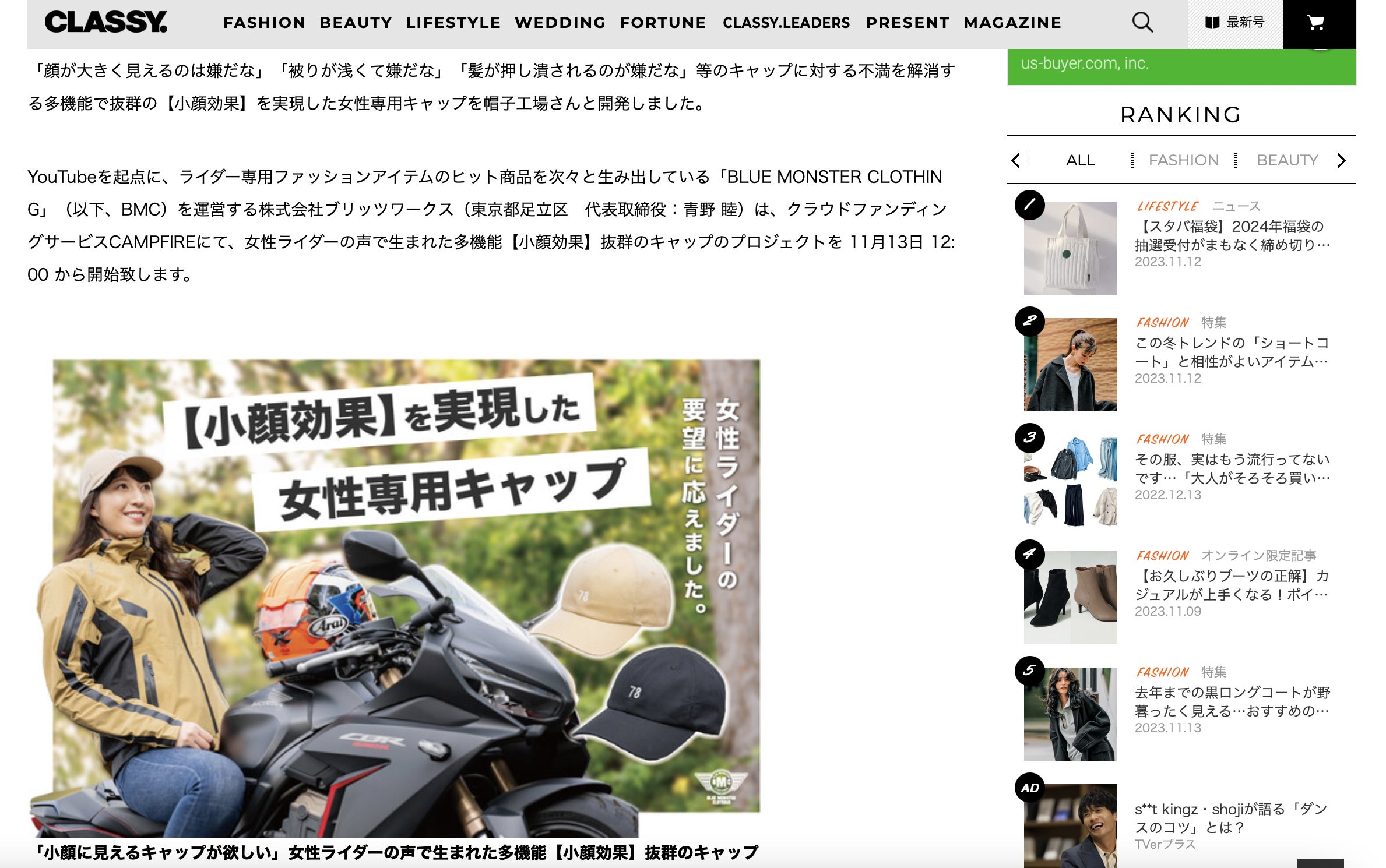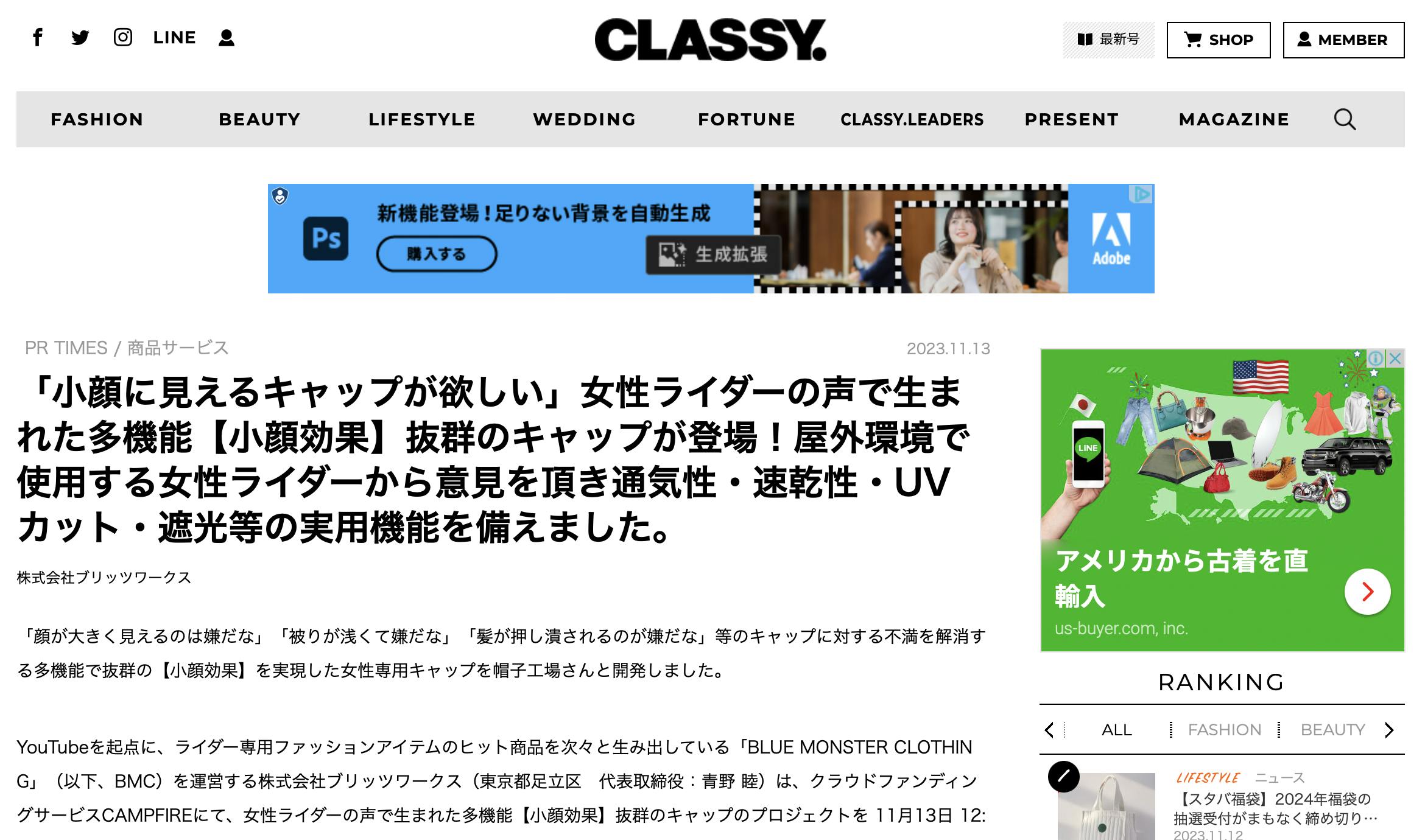 現在各メディアに【小顔効果】抜群のキャップ情報がCLASSY.さんに掲載されております。