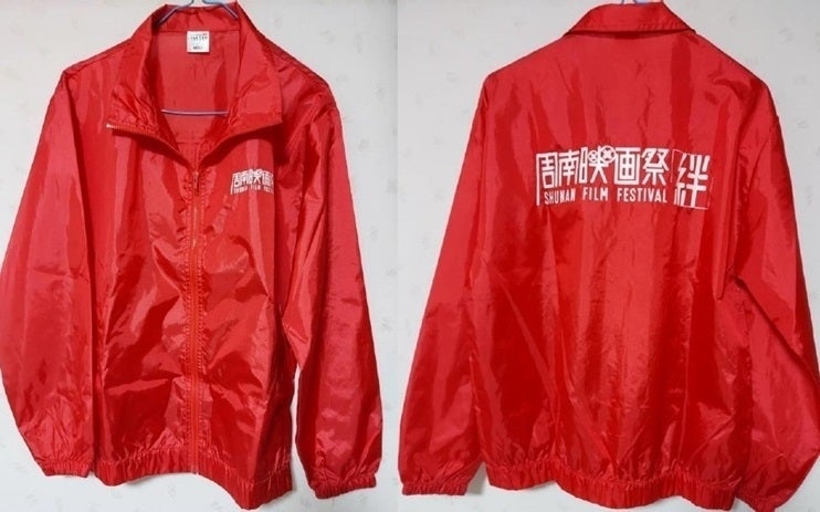 第2 回映画祭から実際に使用しているスタッフジャンパー+映画祭特製手ぬぐい。色:赤のみ、サイズ:S サイズのみ、素材:ナイロン100%、スタッフが実際に使っていたものなので、使用感があることをご了承ください。映画祭特製手ぬぐい、商品サイズ:長さ約90cm、幅約36cm