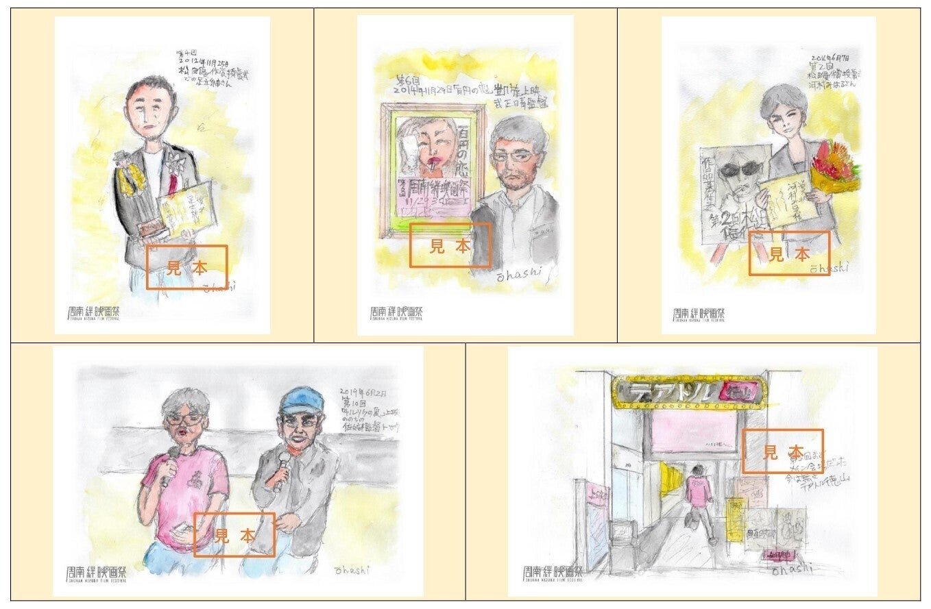 映画祭特製イラストポストカード(大橋委員長が描く「周南『絆』映画祭」あの日あの時)1 セット5 枚入り。