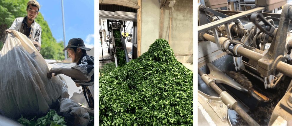 (左:収穫したお茶の荷下ろし中 中、右:お茶工場にて製造中)