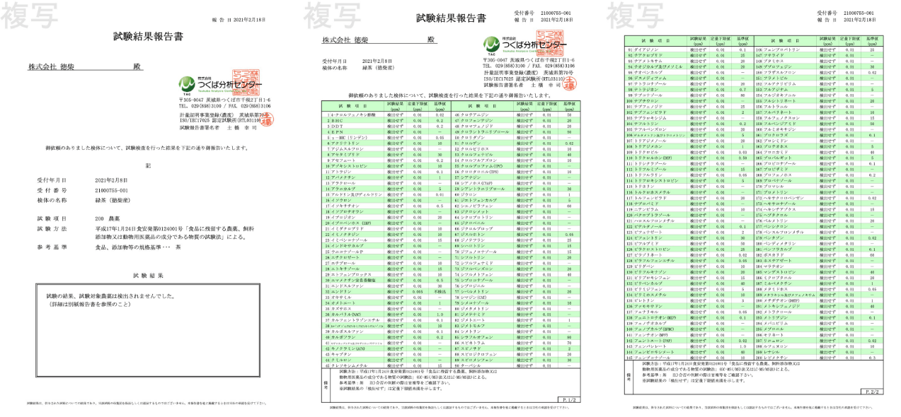また、製品の安全性の証明として有機JAS認定を取得していますが、有機JASの審査の体質により、これだけでは安全性の証明には不十分であると考え、独自で200項目の残留農薬を検査して、全て検出されませんでした。