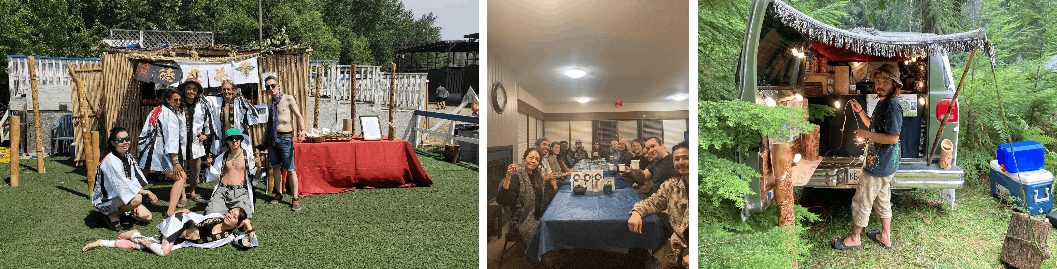 (左:音楽フェスにて出店 中:日本茶ワークショップ 右:自作のモバイルティーショップ)