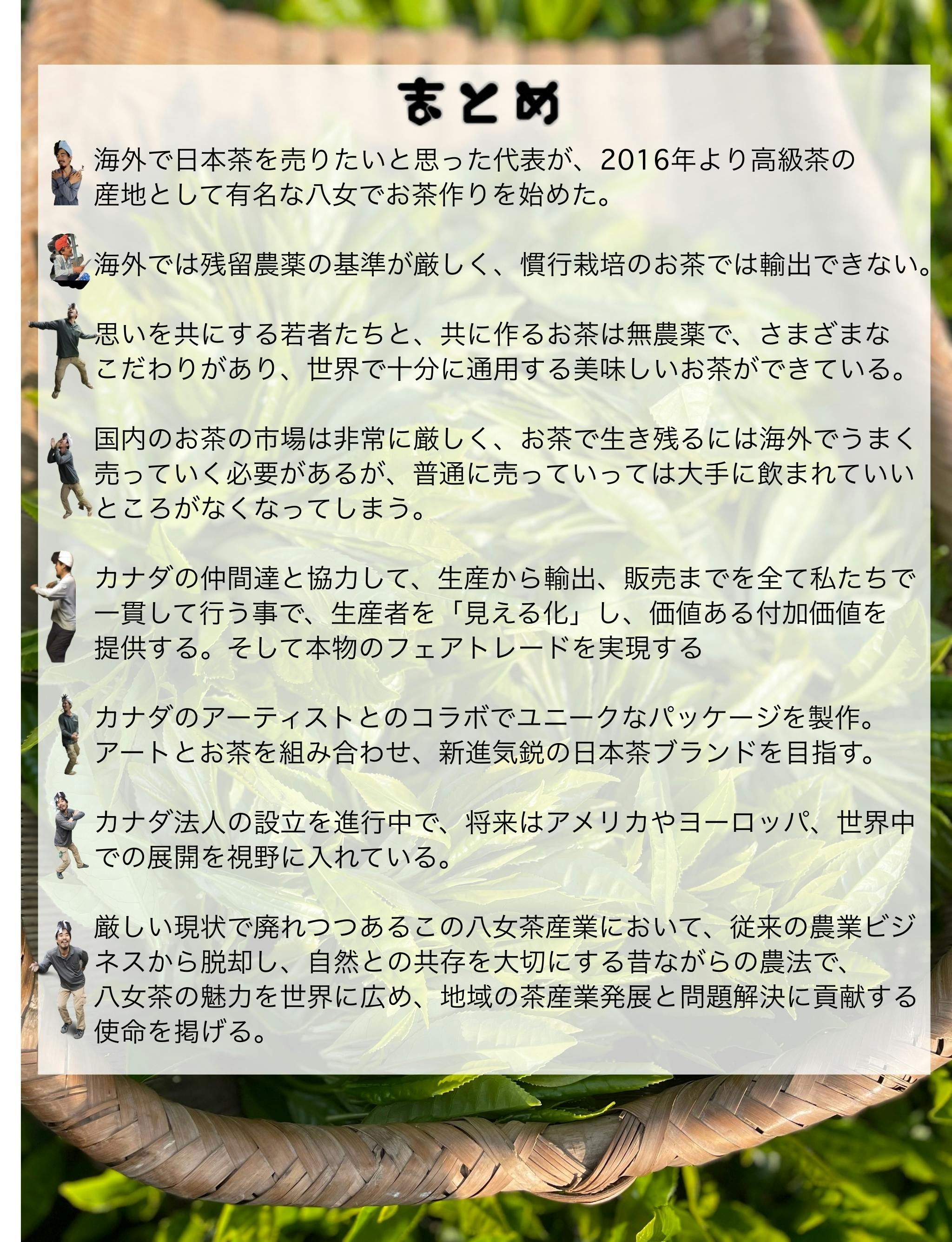 そして将来的には、この地区の廃業された茶園を無農薬栽培のお茶に切り替えることでこの地域の素晴らしい自然との共生を計り、九州八女の高品質なお茶文化を海外に広めて守り抜き発展させていくこと。従来の農業によって廃れかけたこの地区の歴史ある茶産業をV字回復させて地域に良い循環を生み出し、今や限界集落と呼ばれるこの歴史ある地域を再度盛り上げていくこと。
