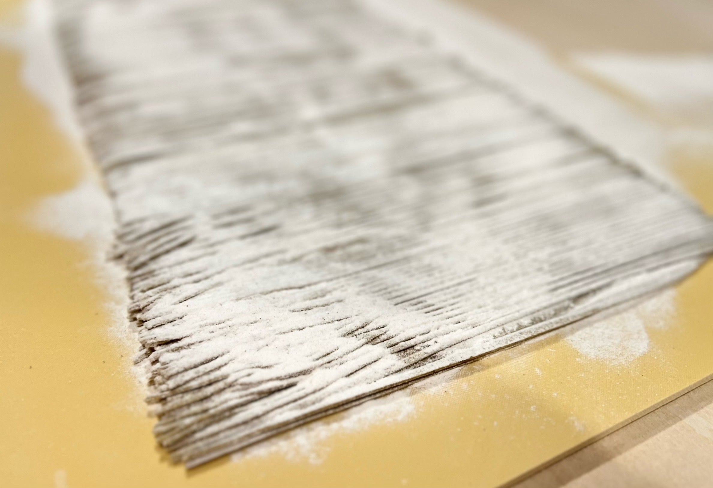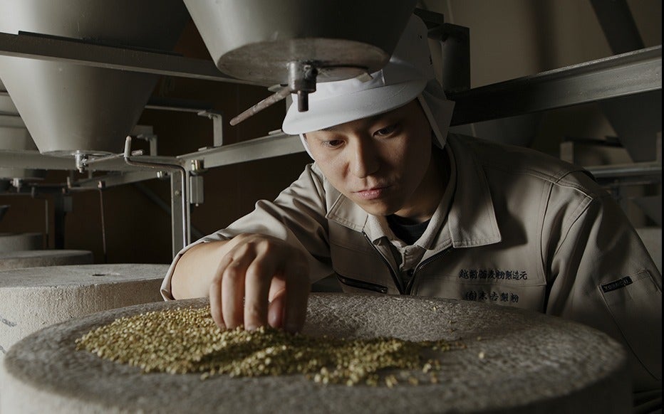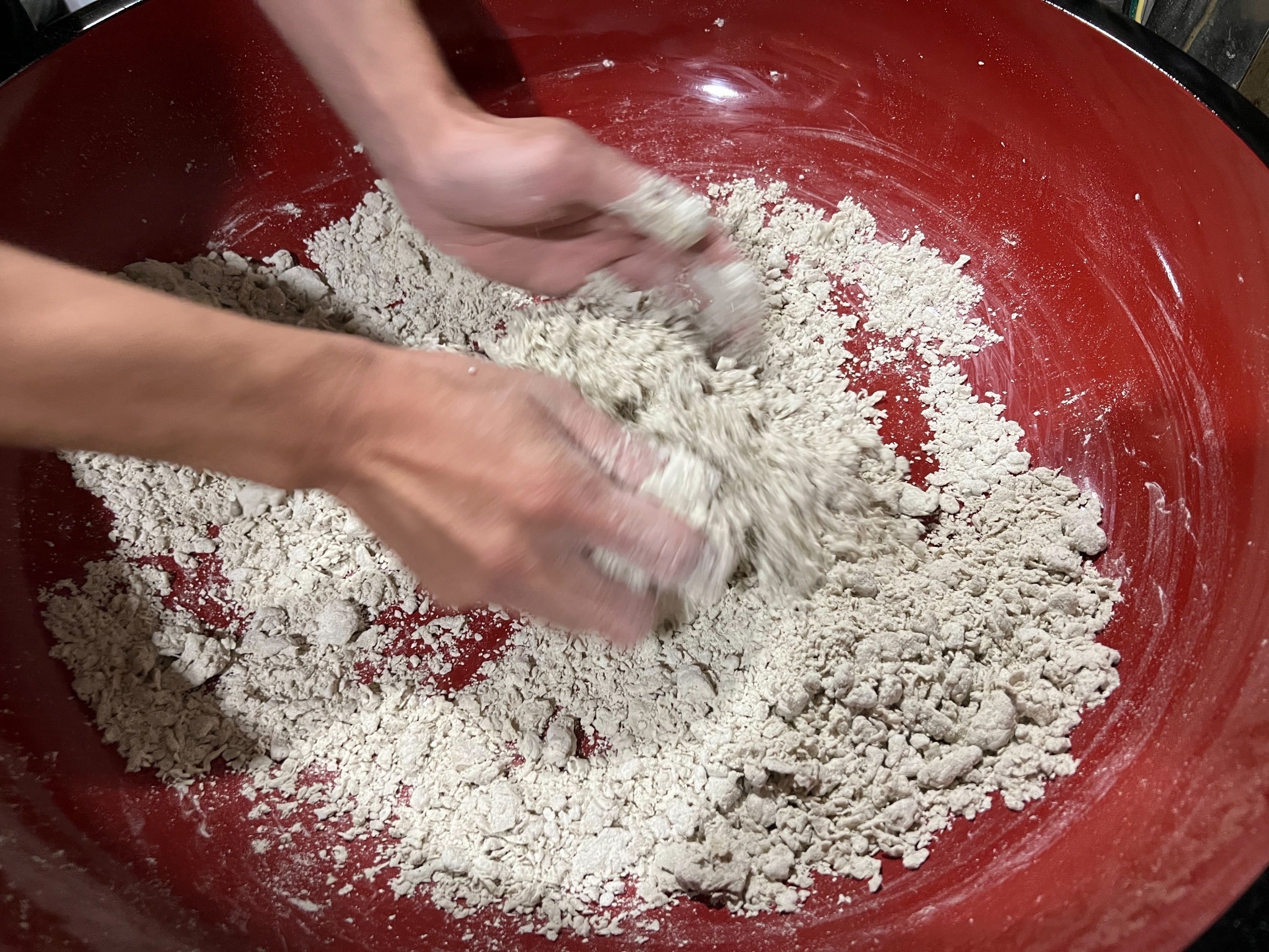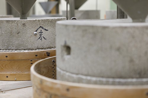 創業当時から100年以上使い続けられているカガセイフンさんの石臼は、福井県内で砕石され熟練の石工の技術で1台1台作られた唯一無二の道具となっており、熱をあまり帯びずソバを切るように時間をかけてじっくり丁寧に製粉するので、風味を損なわず繊維も壊さないため、そば粉自体に適度な湿度感があり、手で握ると形がそのまま残ります。