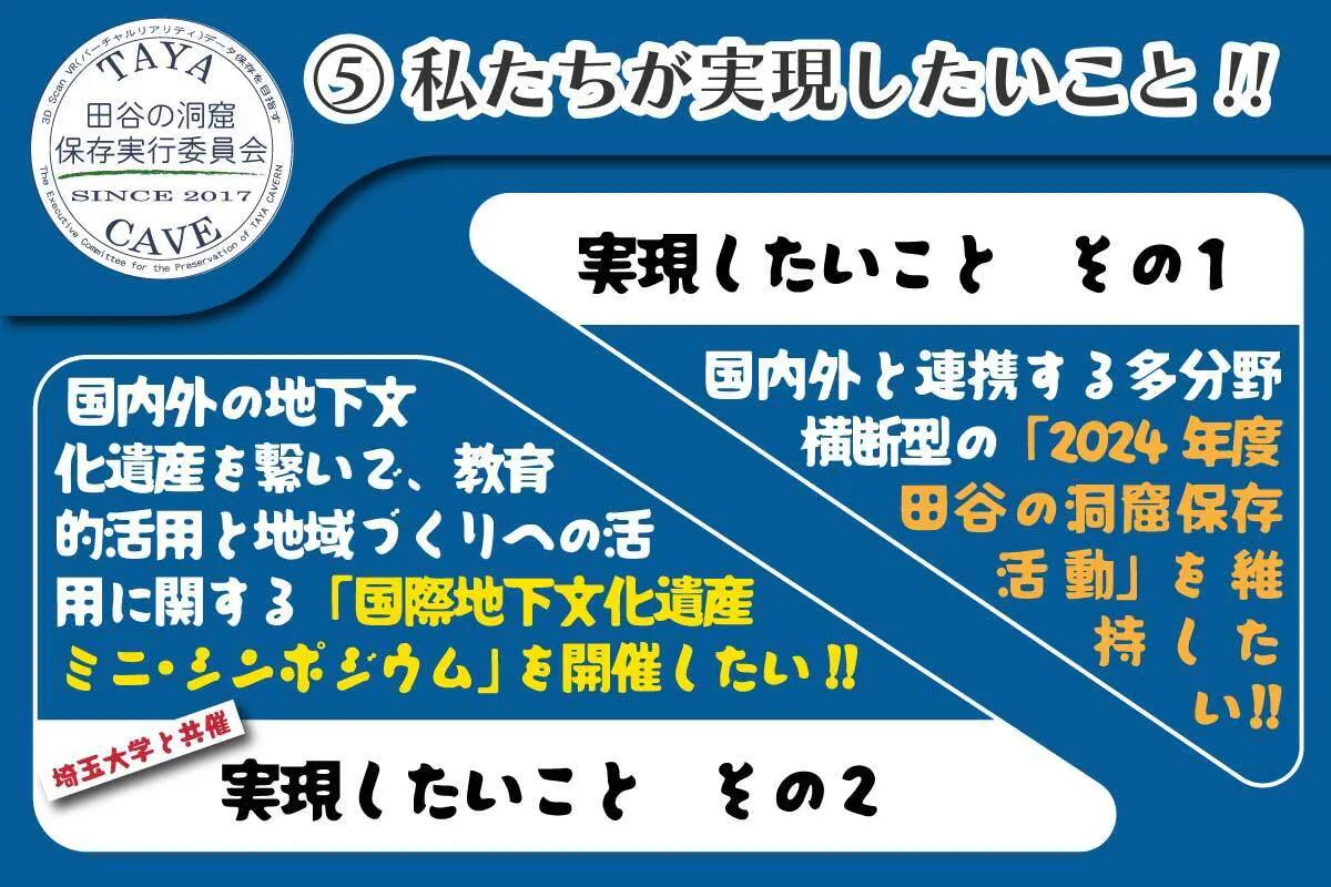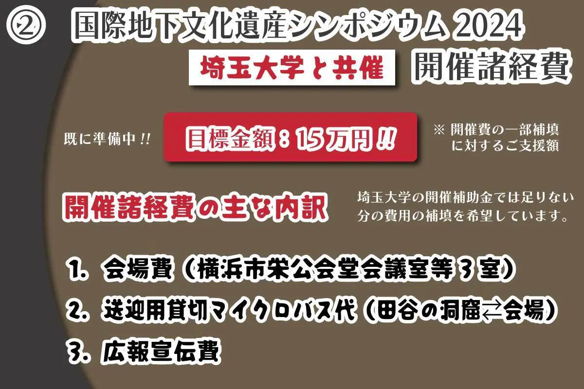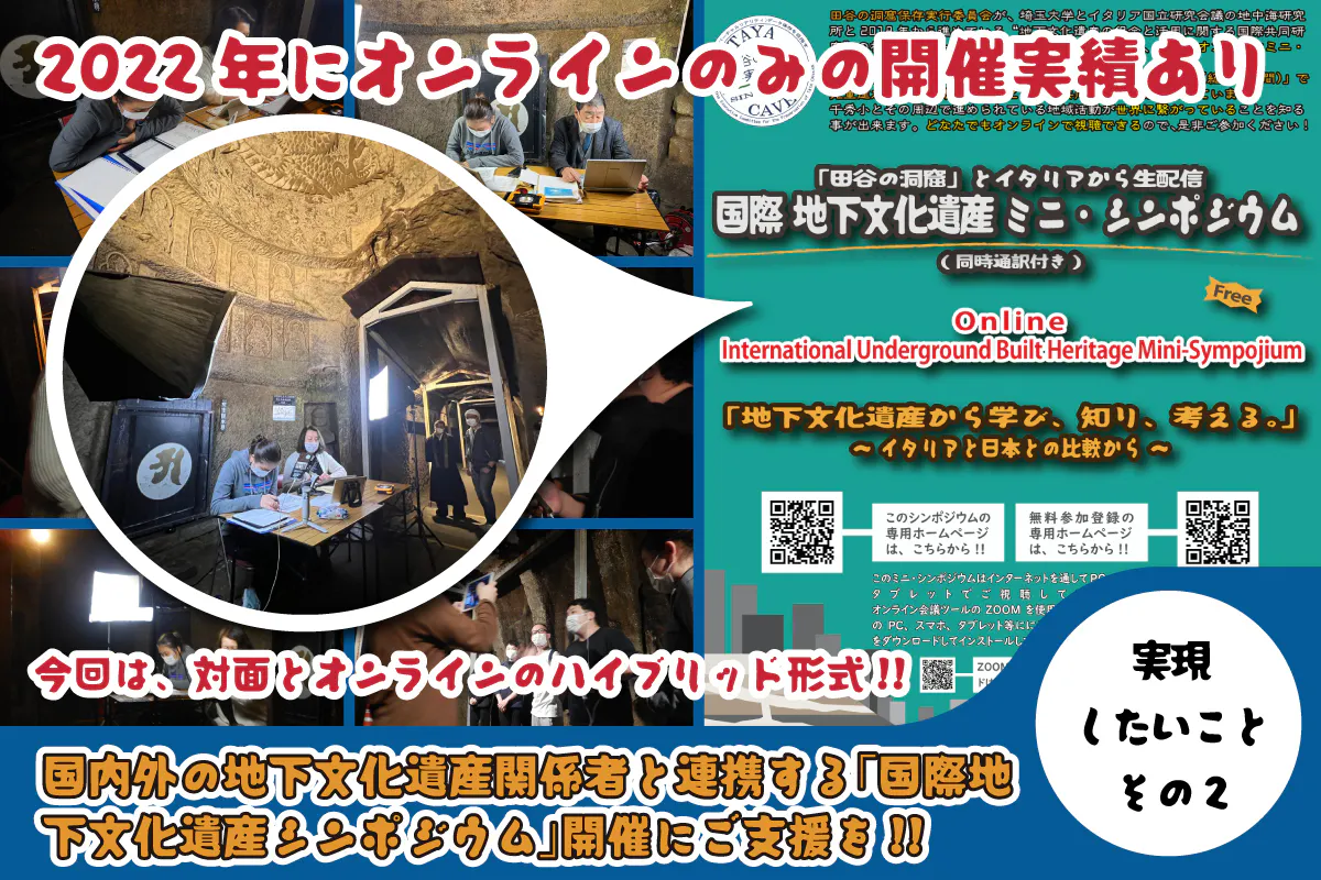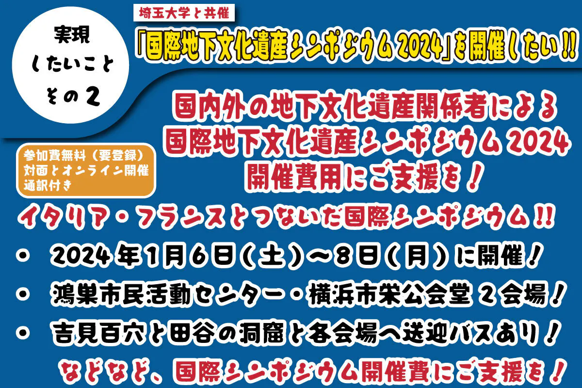 しかし、この活動を止めるわけには行かないという多方面からの要請もあり、強い使命感を私たちは持っています。そのためには、国内外に広く啓発する必要もあり、埼玉大学の協力で「国際地下文化遺産シンポジウム2024」を企画準備しています。海外からゲストを迎えたり、送迎バスを設定したり、開催費が多少ショートしています。