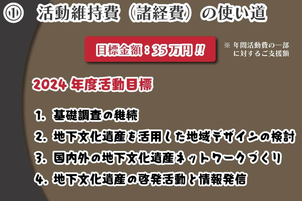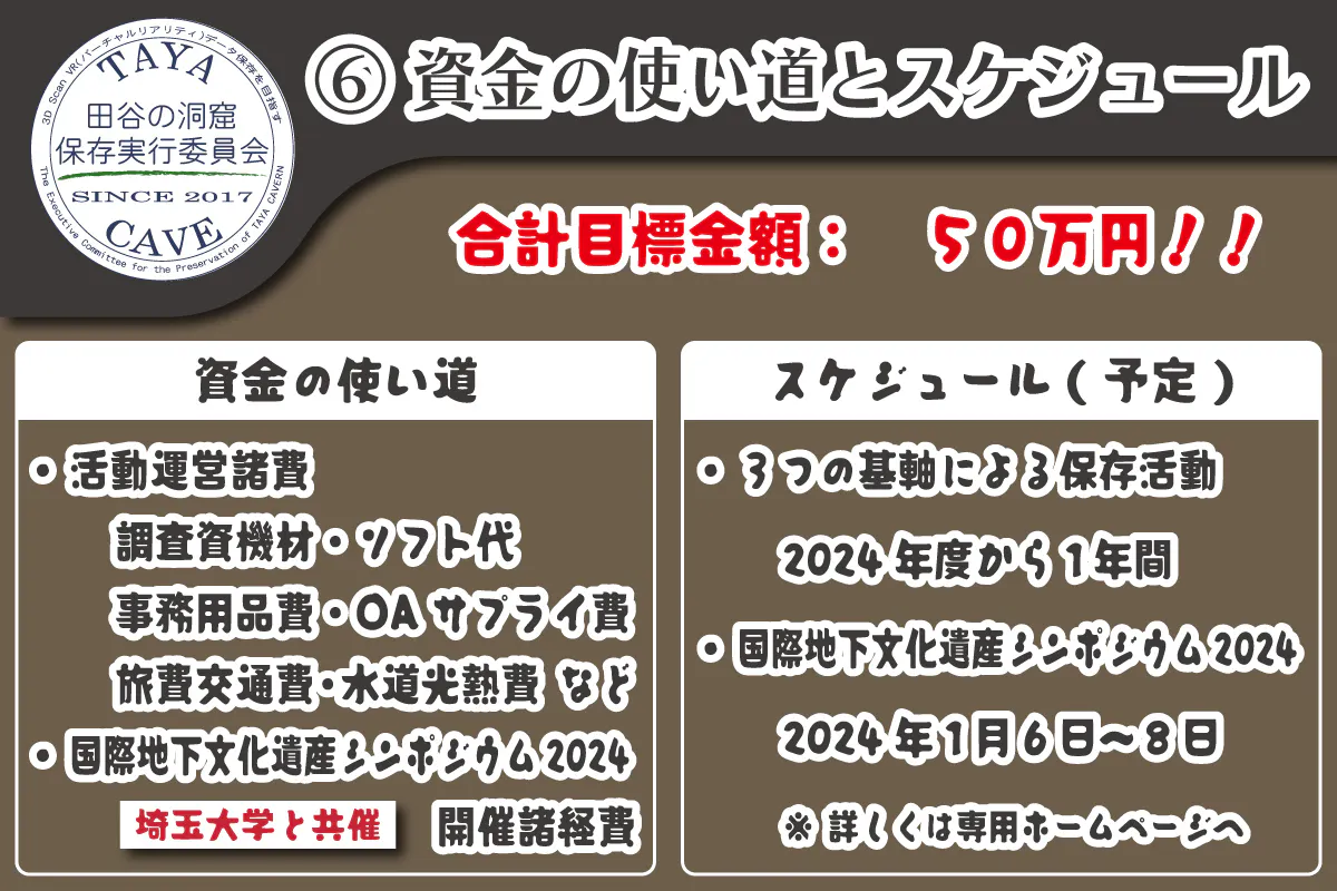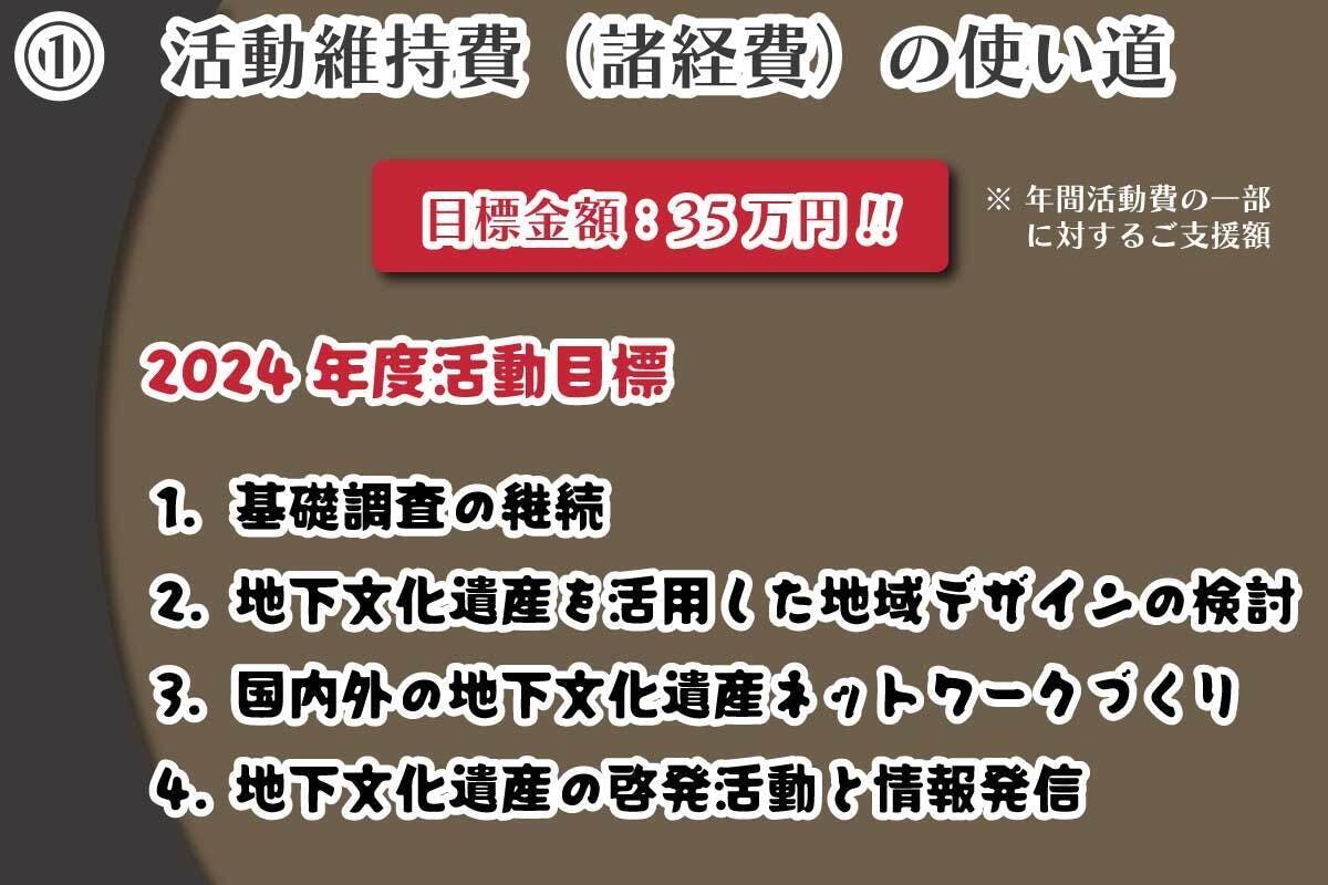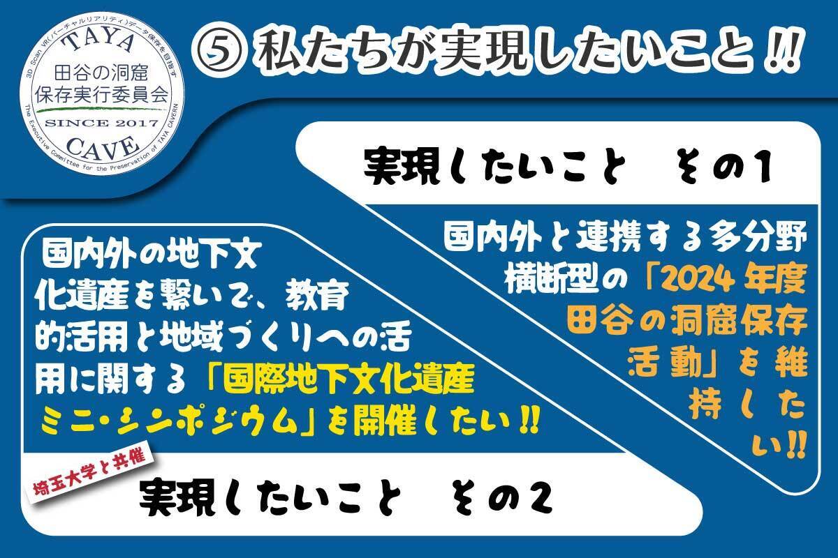 しかし、この活動を止めるわけには行かないという多方面からの要請もあり、強い使命感を私たちは持っています。そのためには、国内外に広く啓発する必要もあり、埼玉大学の協力で「国際地下文化遺産シンポジウム2024」を企画準備しています。海外からゲストを迎えたり、送迎バスを設定したり、開催費が多少ショートしています。