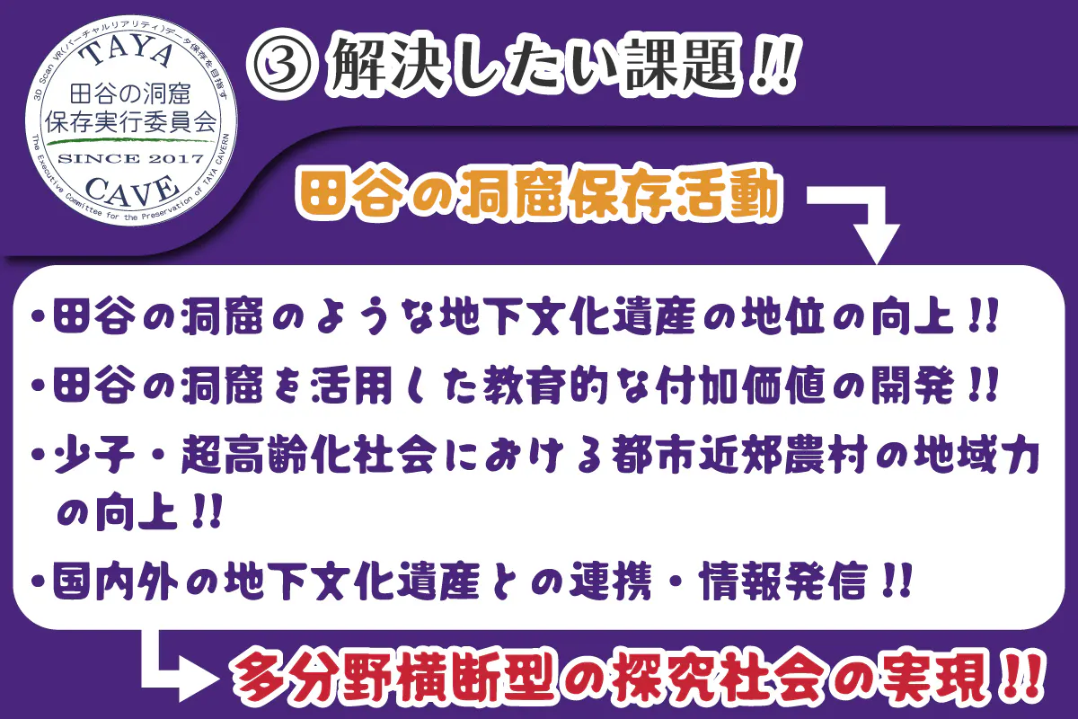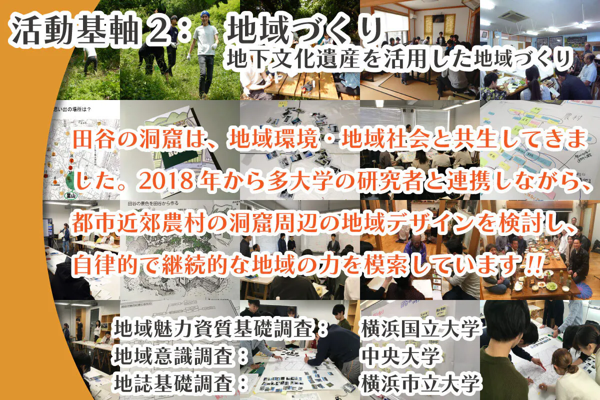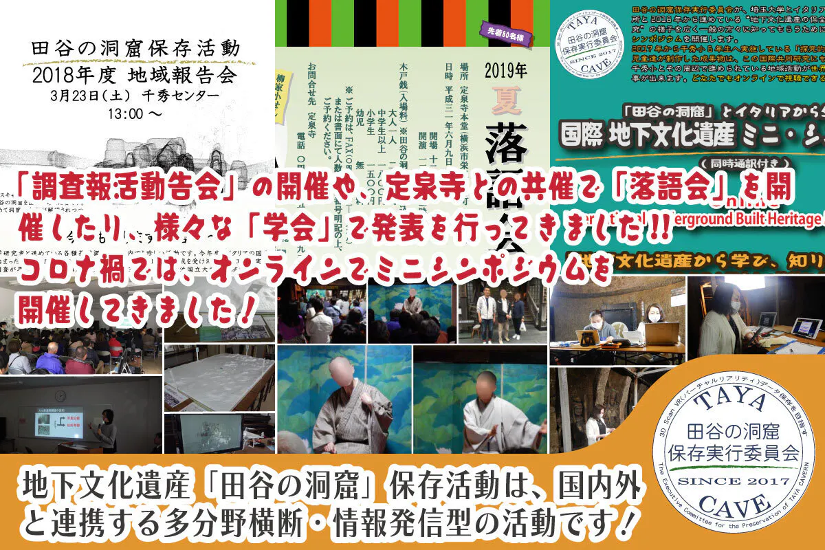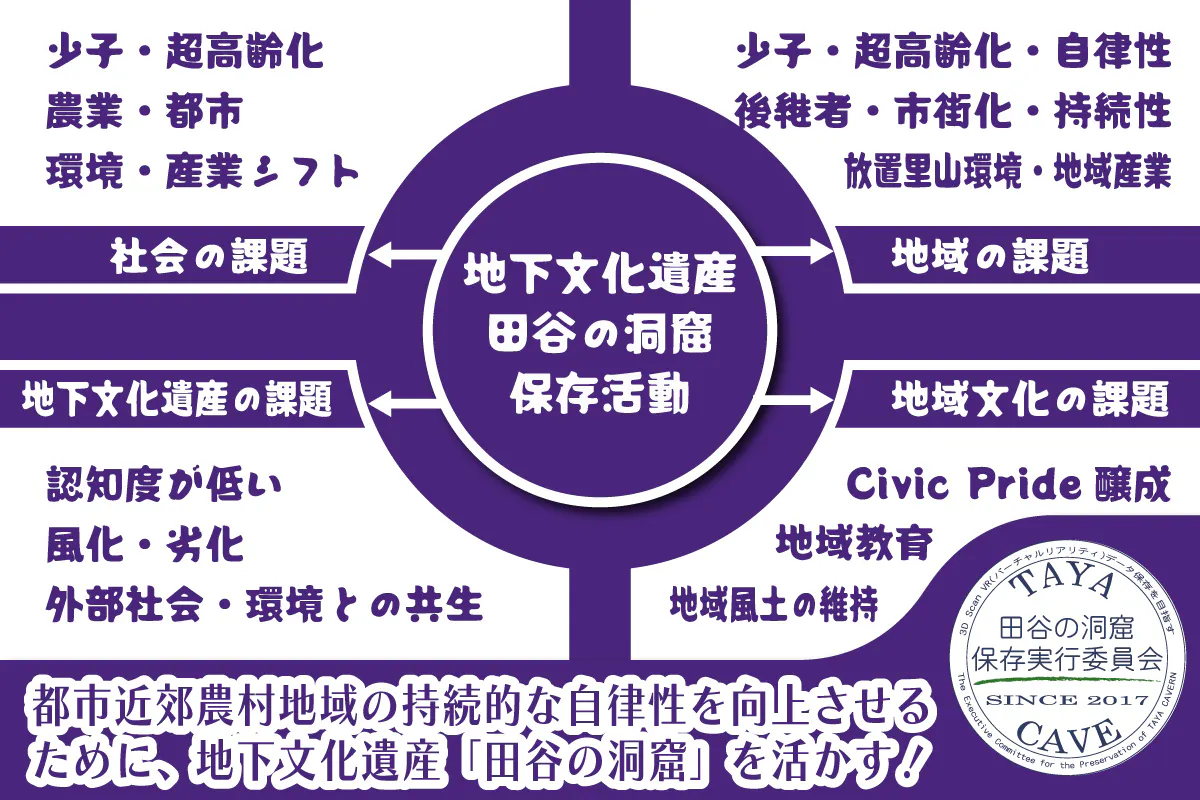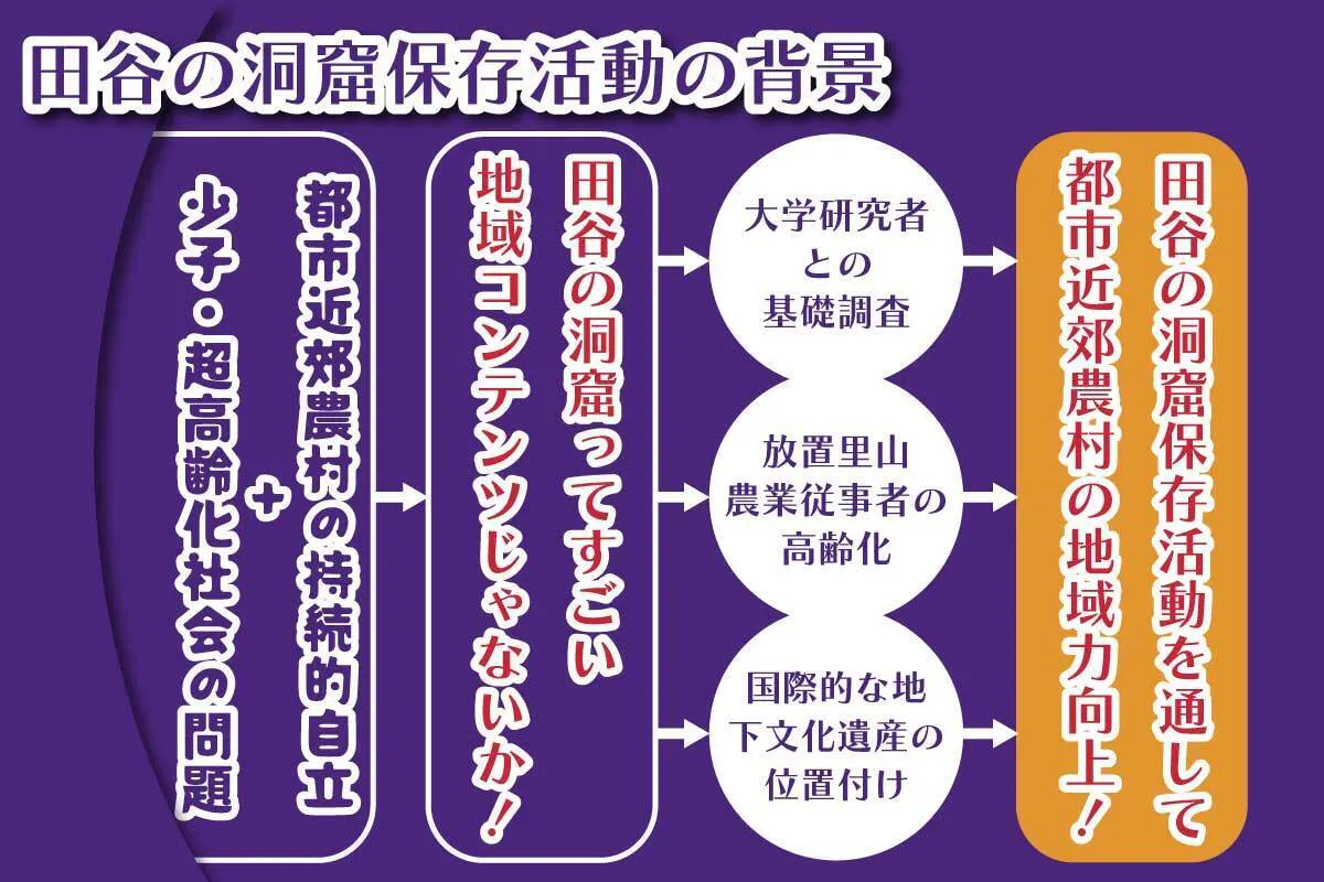 田谷の洞窟保存活動は、「都市近郊農村の未来の地域の在り方や、人のかかわり方を、田谷の洞窟という地下文化遺産を通して創り上げていこうという活動」です。