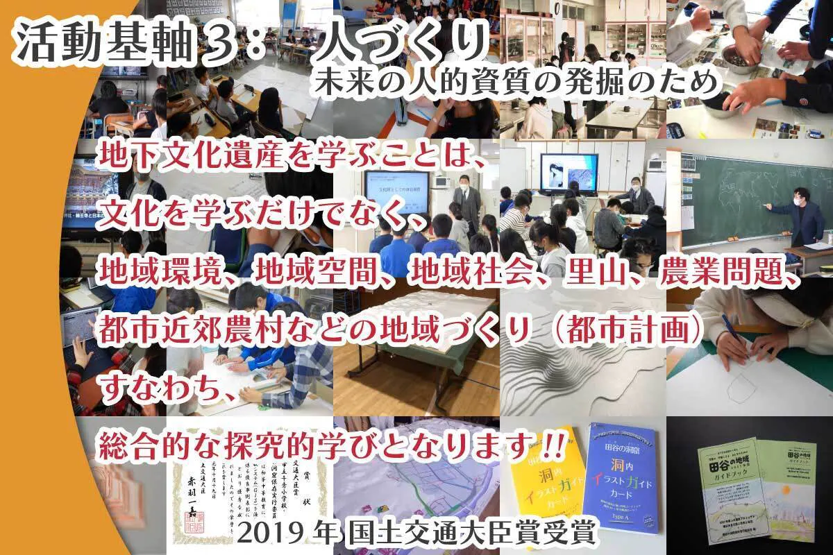 世界では、その価値の多様性をきちんと見つめており、重要な遺産として扱われています。しかし、我が国ではそうでもありません。2017年から続けてきた私たちの保存活動を通して見つめ直されてきたことの一つに、「田谷の洞窟」のような地下文化遺産は、「初等教育等における重要な教材となりうる」と考えています。環境や地形、地域社会の構造や問題点など、多岐にわたる教育的な観点を地下文化遺産は含んでいます。これは、地下文化遺産をとても有効な教育的なコンテンツと考えるに足る大切な意味があるのではないかと言えます。
