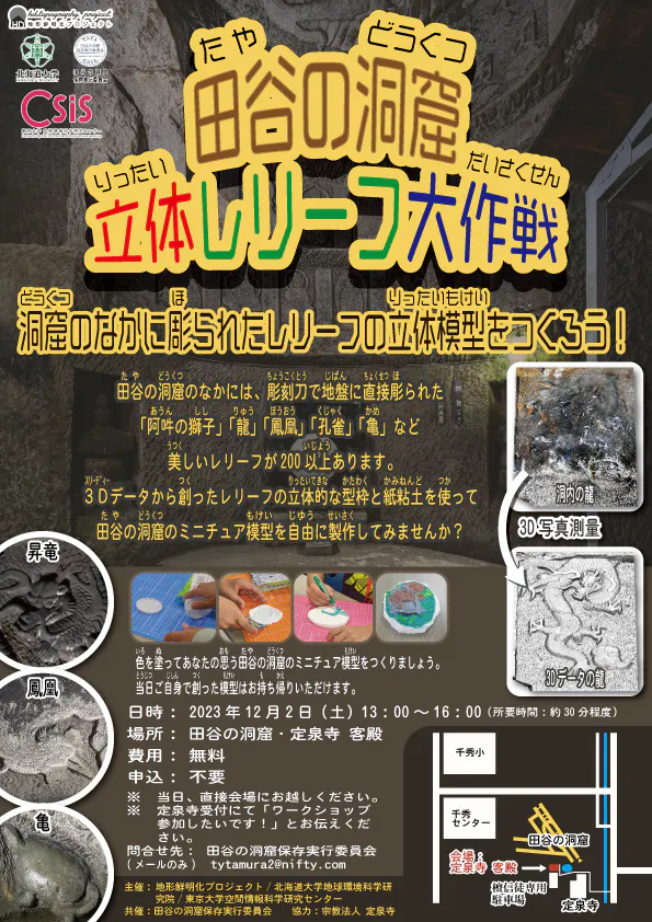 これまで取得した洞内の3Dデータを活用して、小中学生対象の無料の立体レリーフ模型の製作のワークショップを北海道大学の早川先生と共催します。