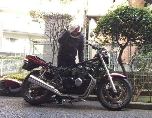 ベース車両です。 ゼファーx 400cc ガソリンタンクを黒に塗装します。 その後カウルの製作と取り付けのため、千葉まで運びます。