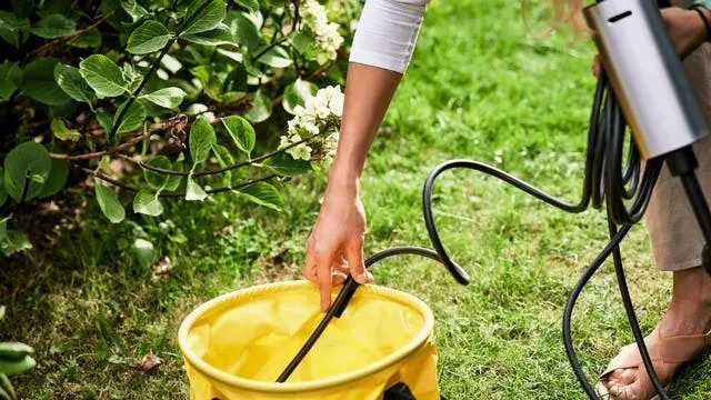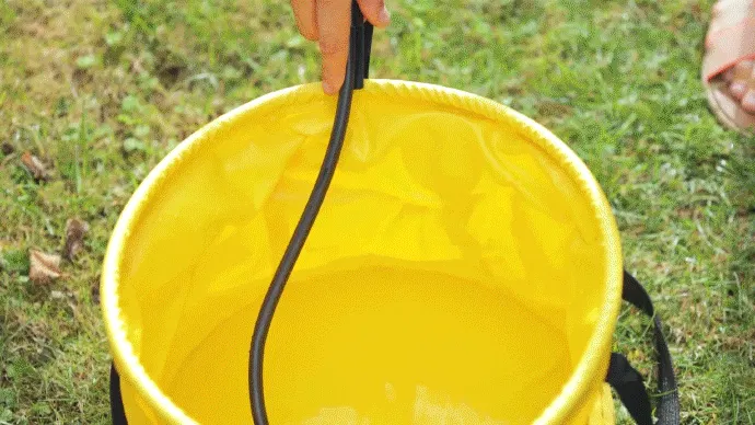 3. ホースの先端(フィルター)をバケツに入れ、ノズルを回して水圧を調整、ロックを解除したらレバーを引いて使用可能です。