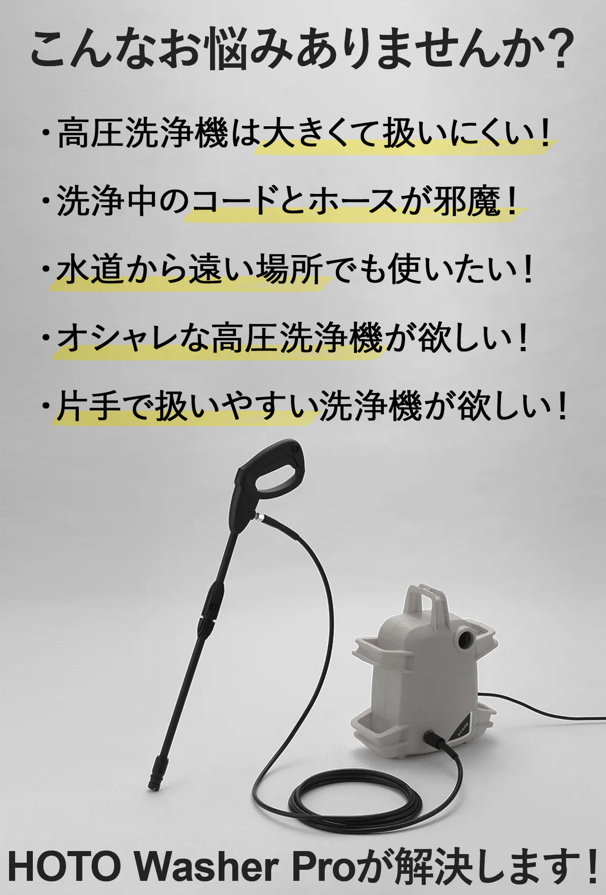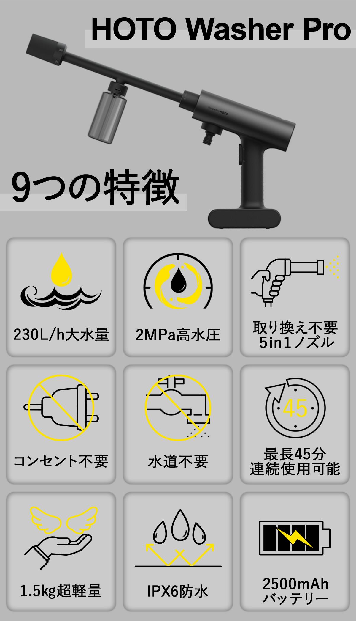 HOTO Washer Proは軽量コンパクト設計、パワフルなのに簡単操作でスムーズに洗浄できる革新的な高圧洗浄機です!